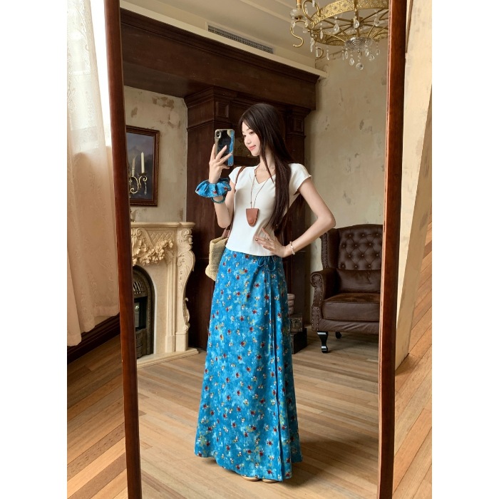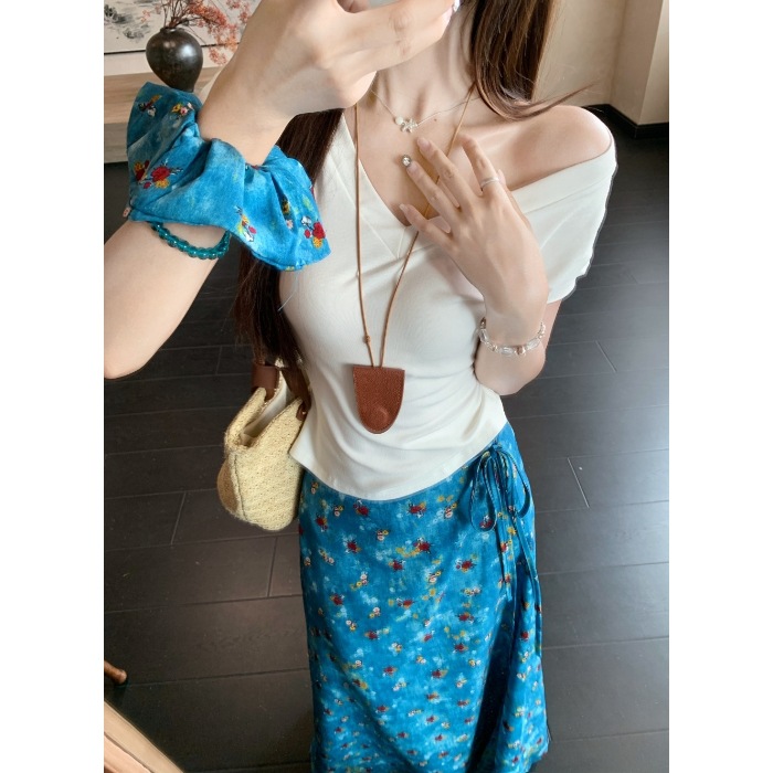 패션 세트 화이트 v 넥 반팔 티셔츠 여성 여름 하이 웨이스트 슬리밍 꽃 스커트 투피스 세트