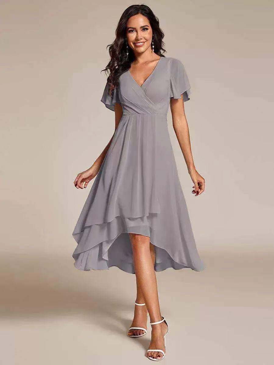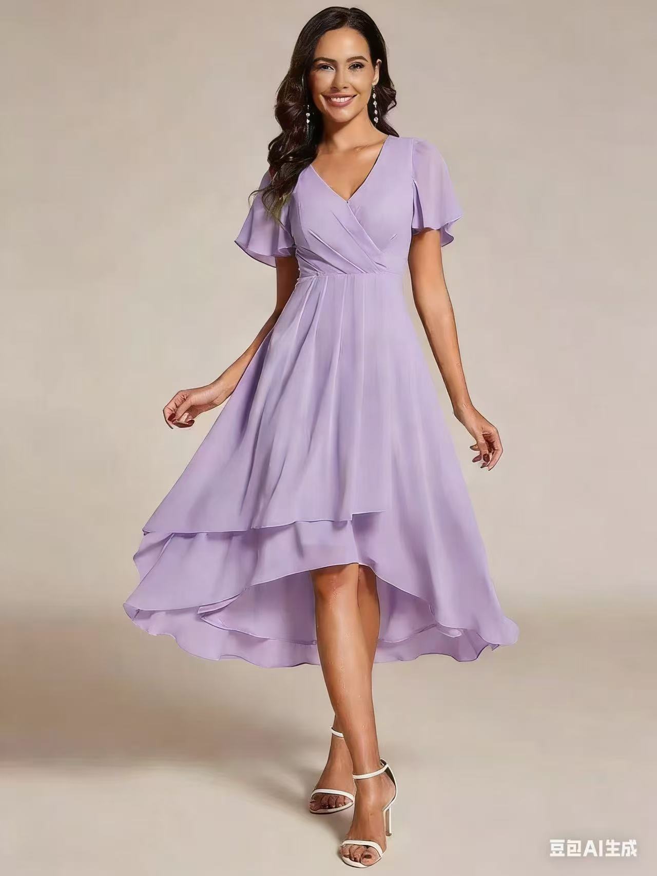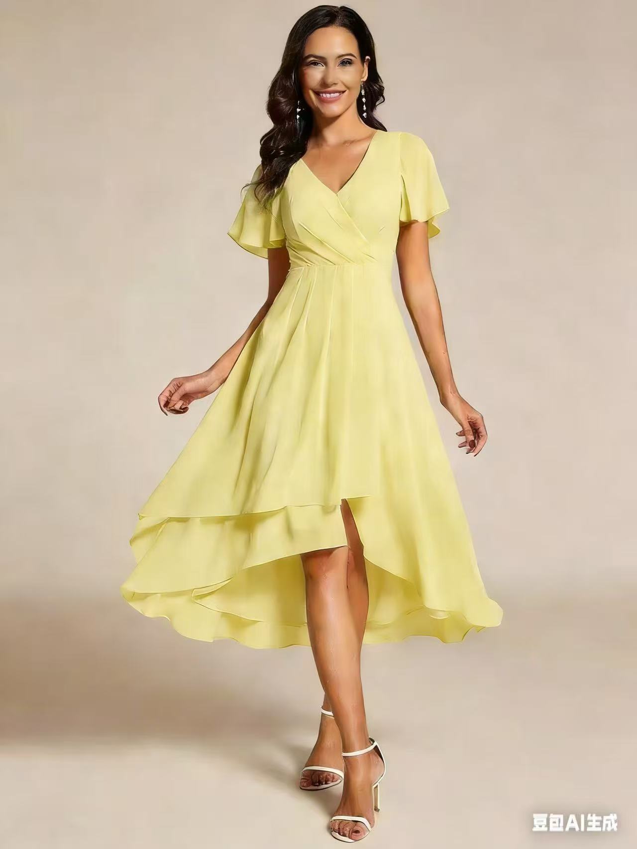 2025년 핫세일 신상 유럽 및 미국 스타일 여름 솔리드 컬러 브이넥 러플 소매 쉬폰 우아한 파티 드레스