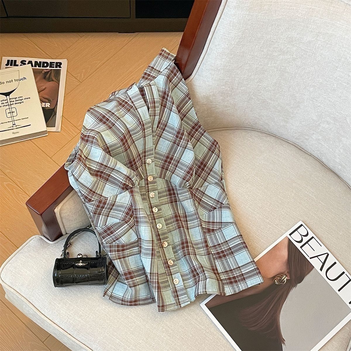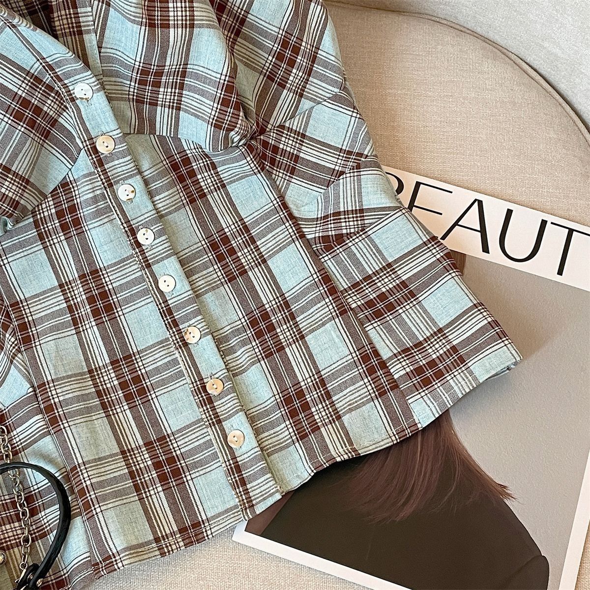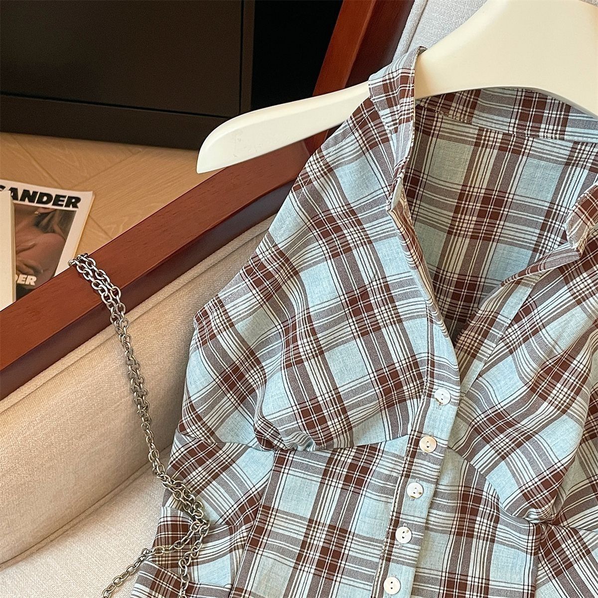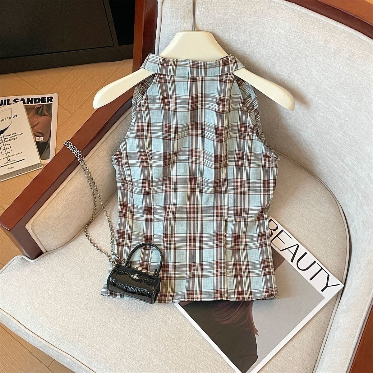 여성을위한 작은 격자 무늬 하프 오픈 칼라 셔츠 여성을위한 여름 새로운 싱글 브레스트 민소매 짧은 홀터 탑