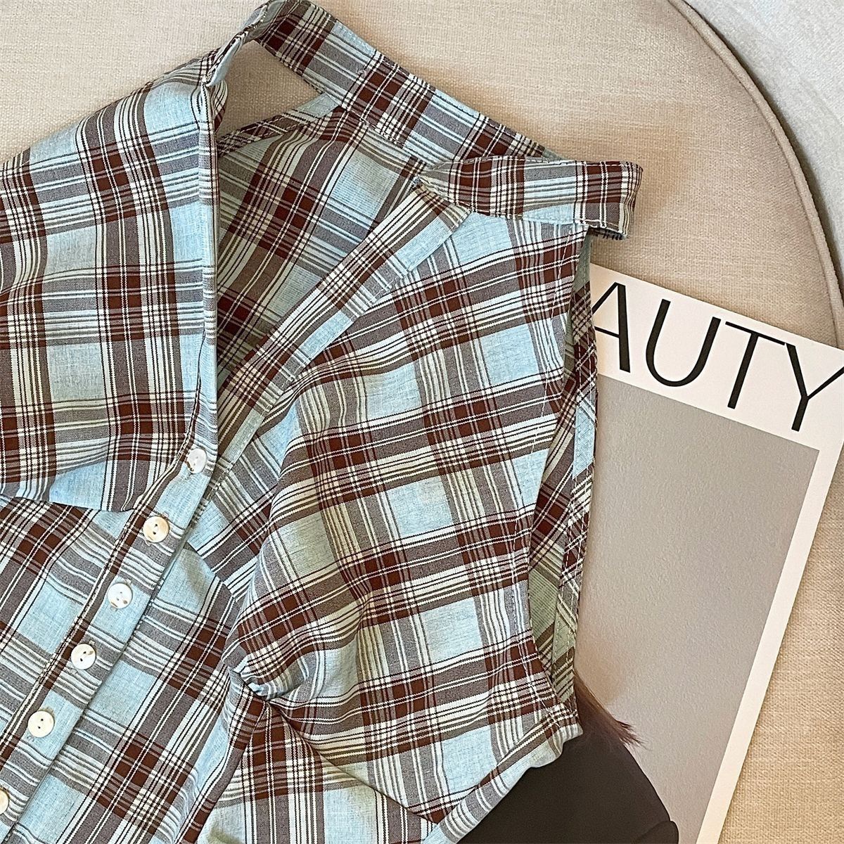 여성을위한 작은 격자 무늬 하프 오픈 칼라 셔츠 여성을위한 여름 새로운 싱글 브레스트 민소매 짧은 홀터 탑스토어 가기
