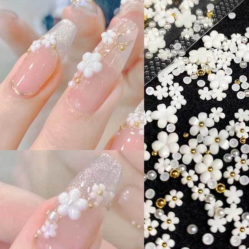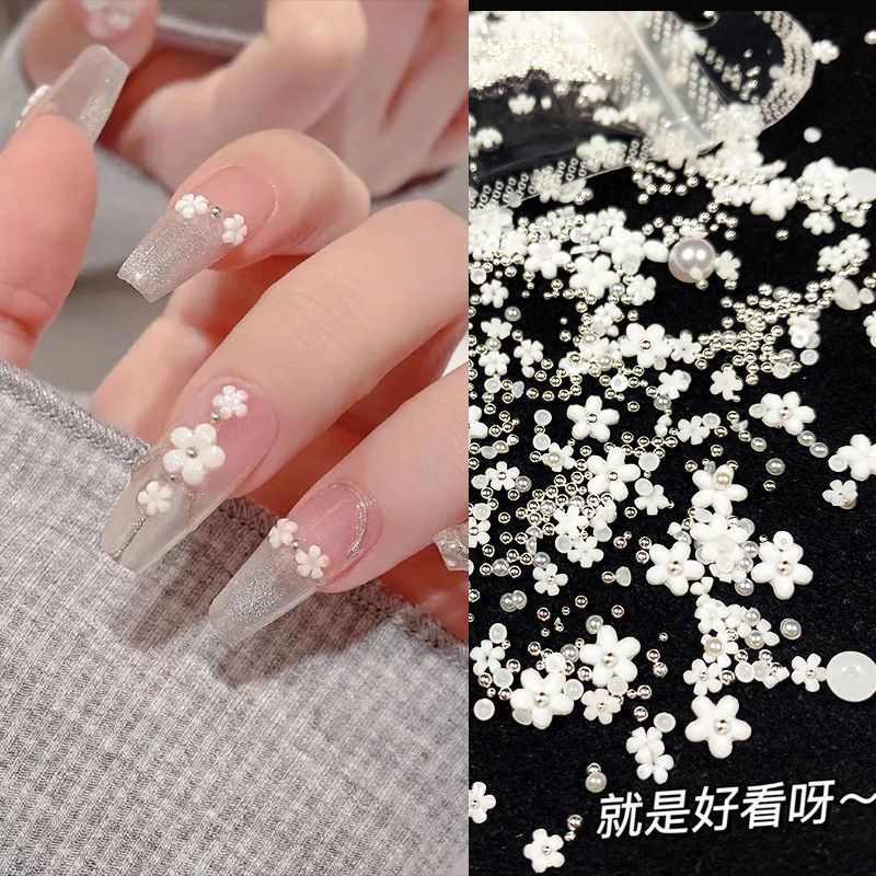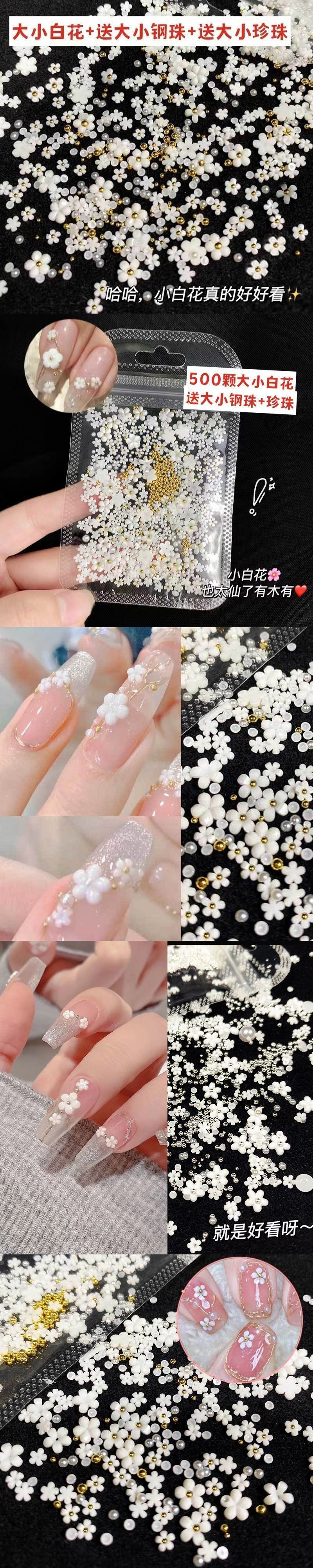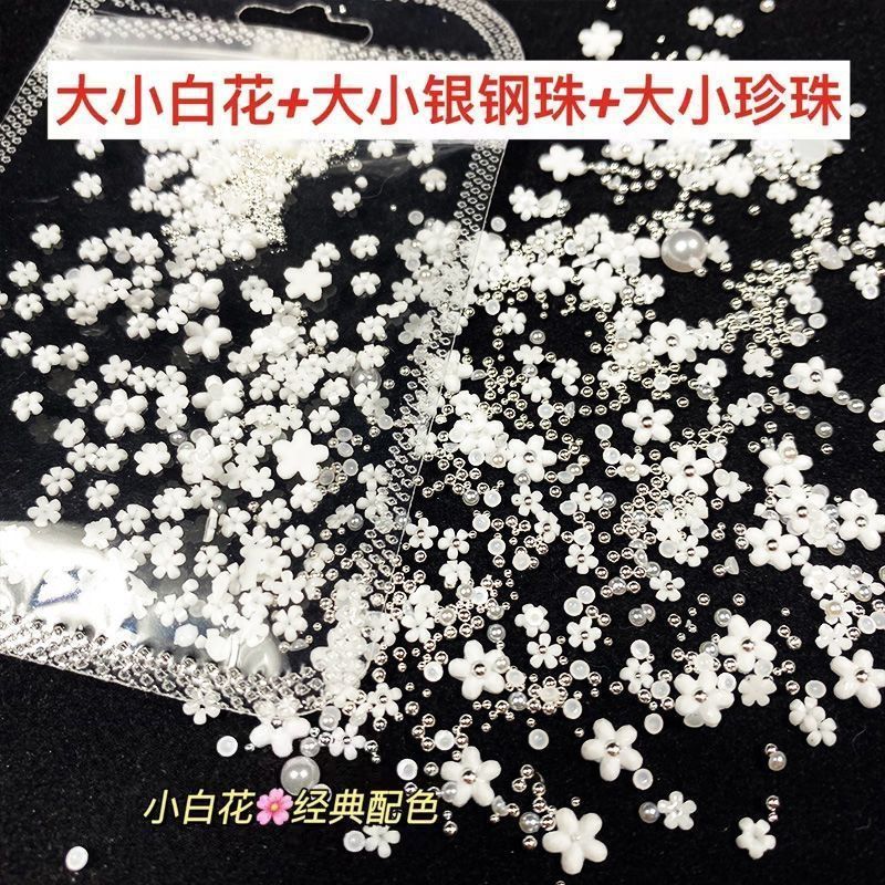 크고 작은 흰색 입체 다섯 꽃잎 네일 아트 액세서리, 혼합 작은 꽃, 인터넷 연예인 네일, 인기 있는 스틸 비즈, 진주 꽃, 새로운 스타일스토어 가기