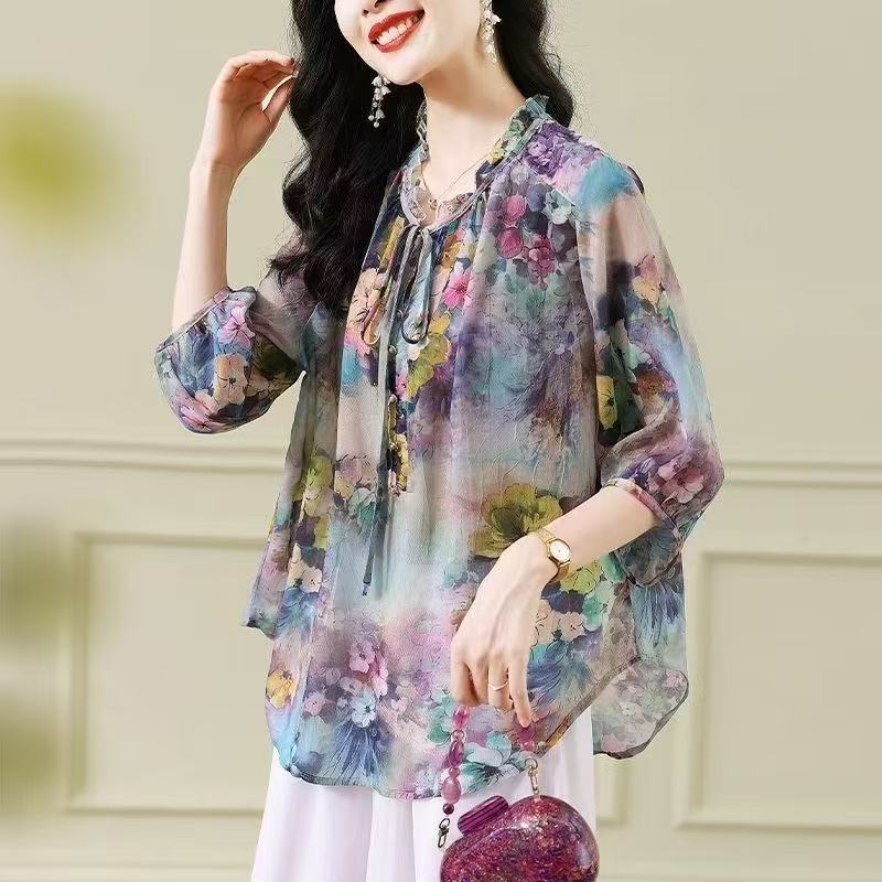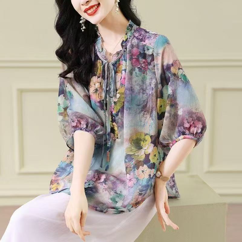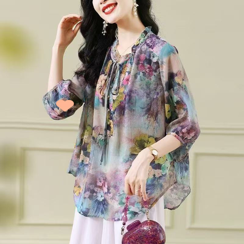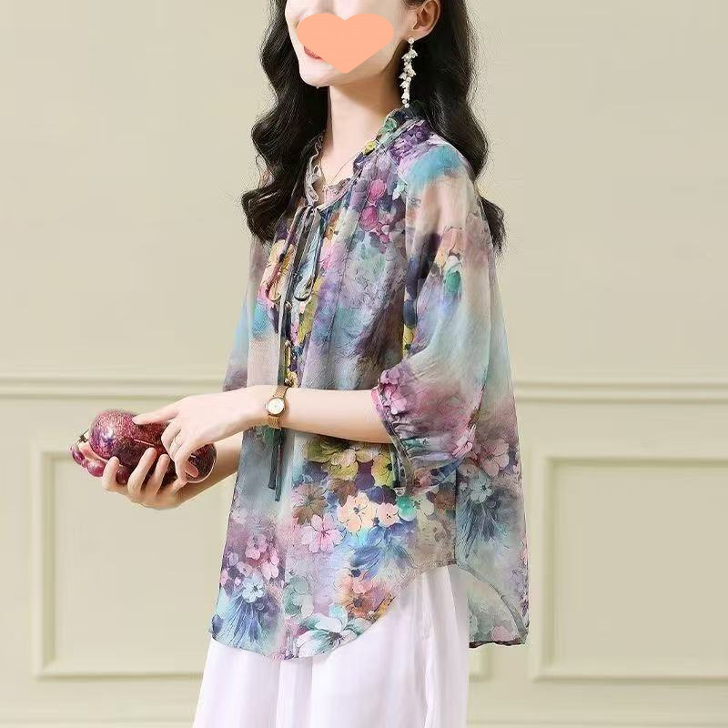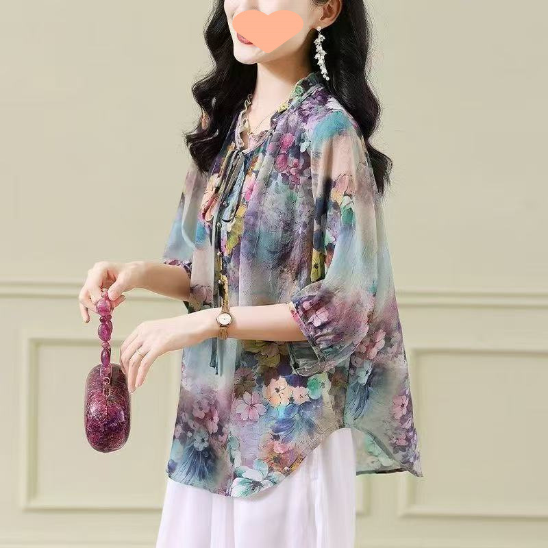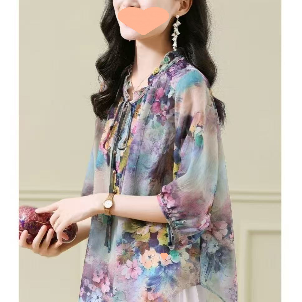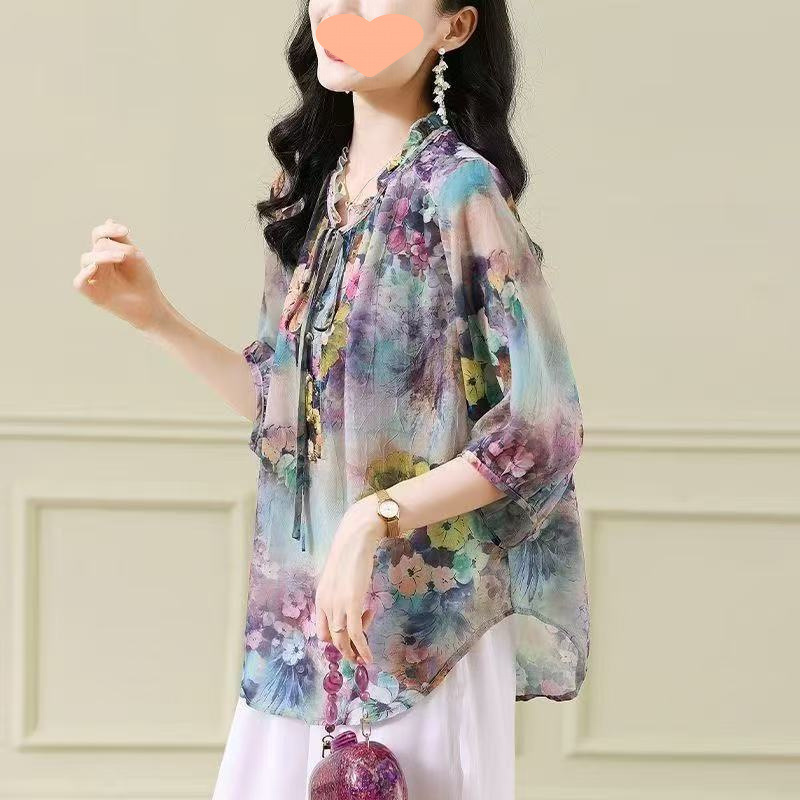 여름 꽃무늬 고급 복고풍 루즈한 배를 커버하고 슬림해 보이는 고귀하고 세련된 여성용 플러스 사이즈 엄마 쉬폰 셔츠스토어 가기