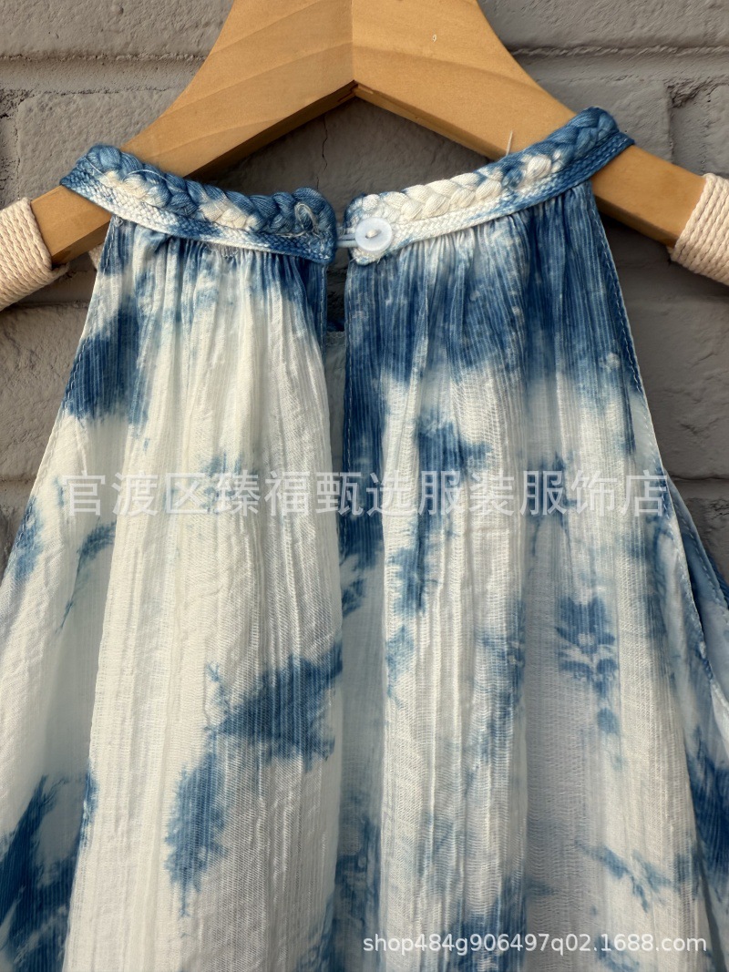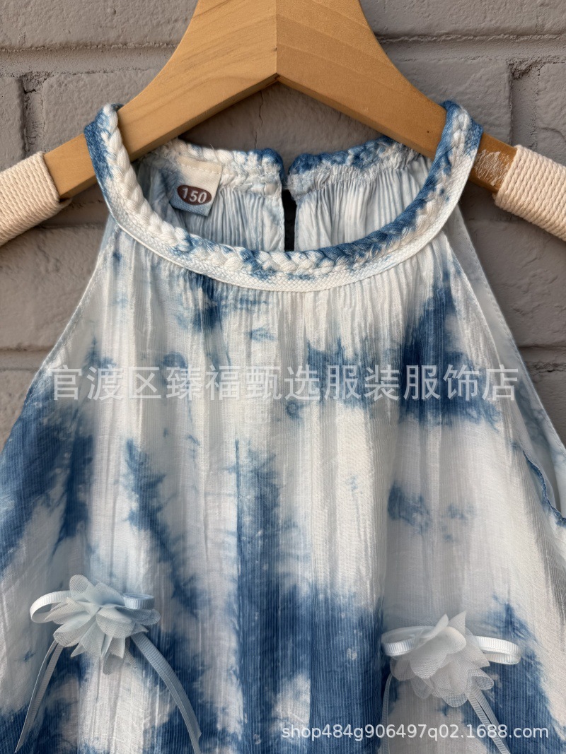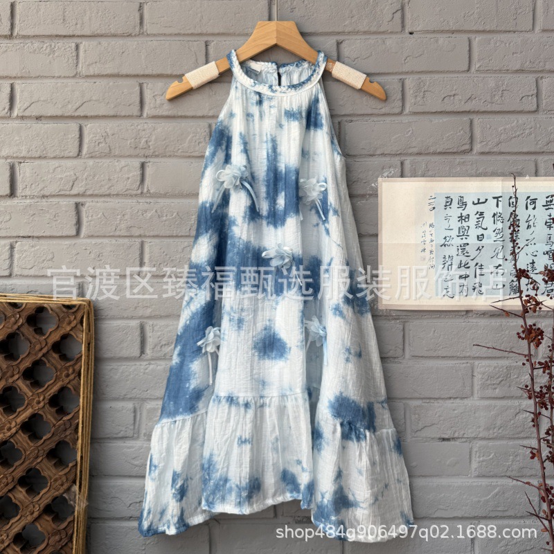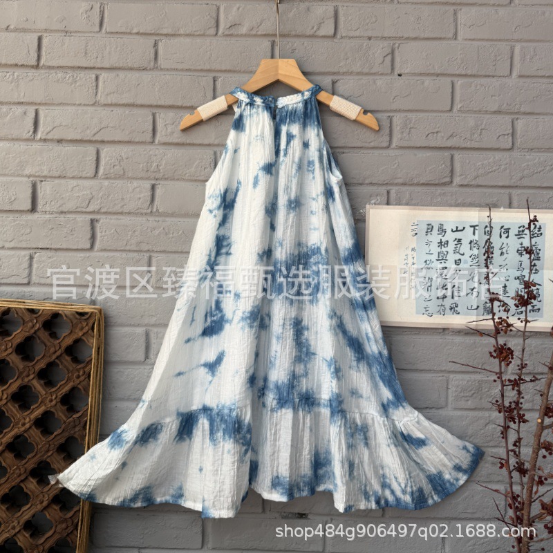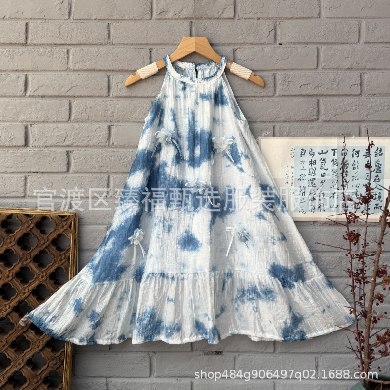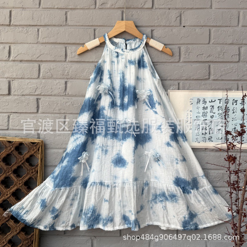 핸드메이드 타이다이 블루 염색 홀터넥 서스펜더 스커트 드레스 로우 엣지 칼라 여아 미디 스커트 아동용 홀터넥 스커트 아동복