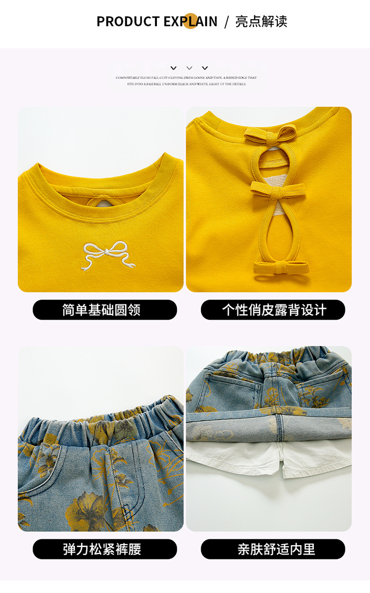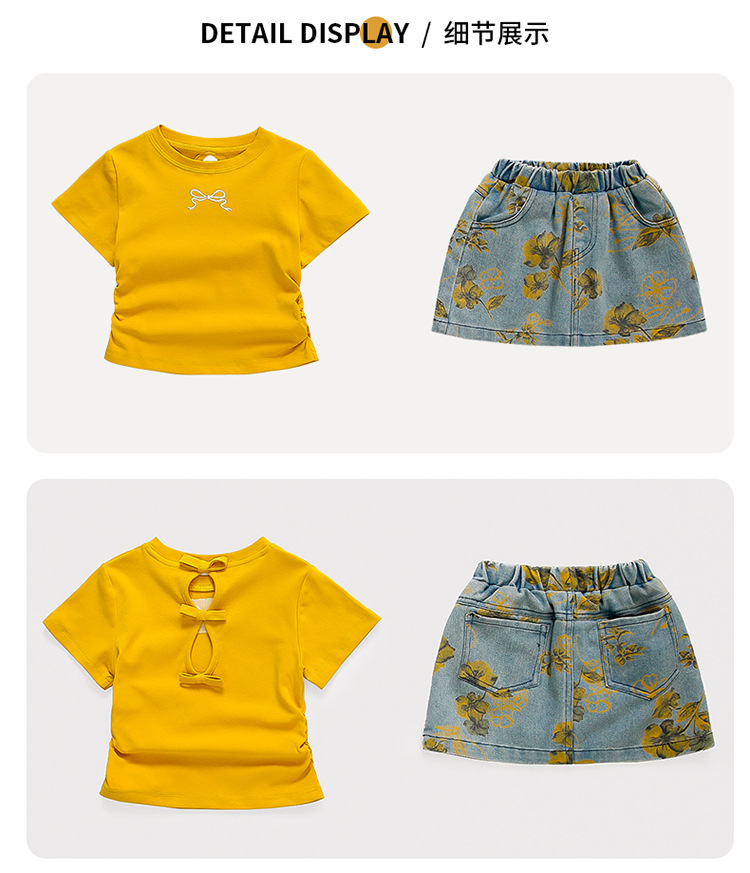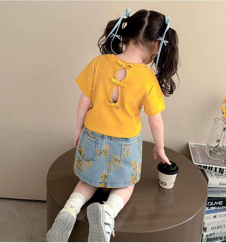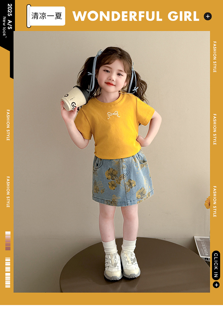 여자 보우 데님 스커트 정장 2025 여름 새로운 패션 어린 소녀의 세련된 투피스 세트 중소 어린이를위한스토어 가기