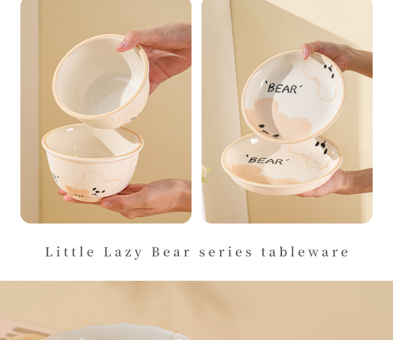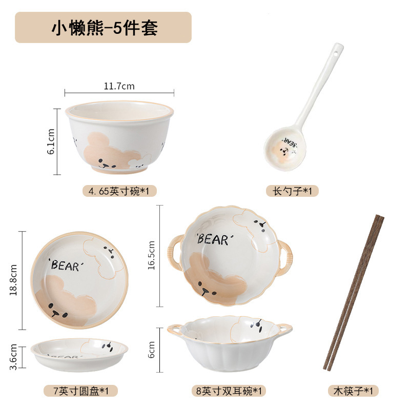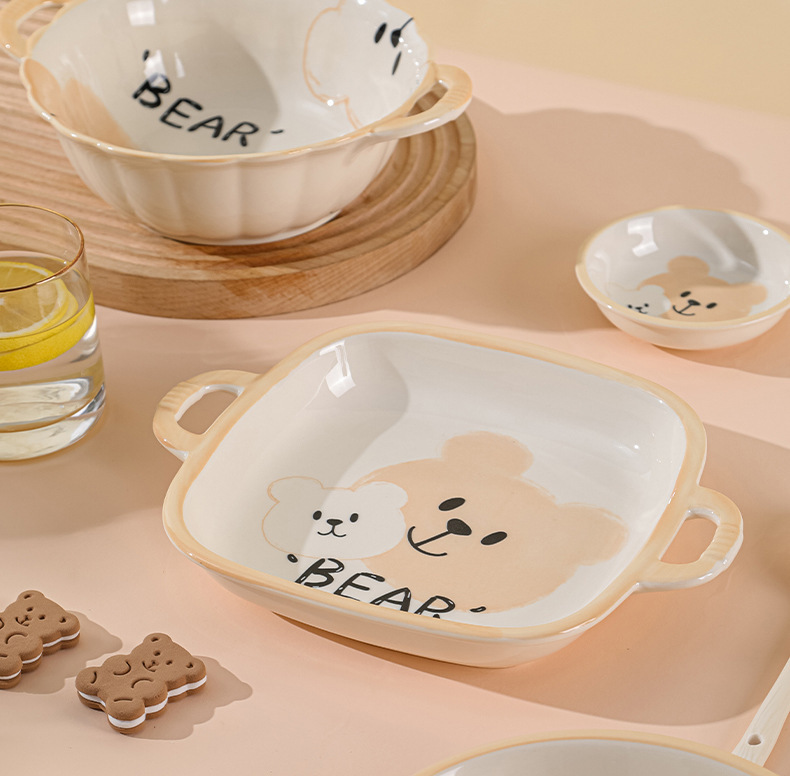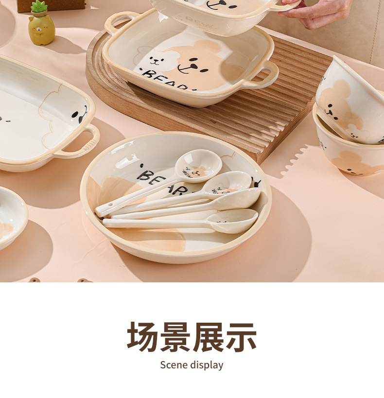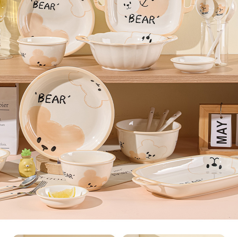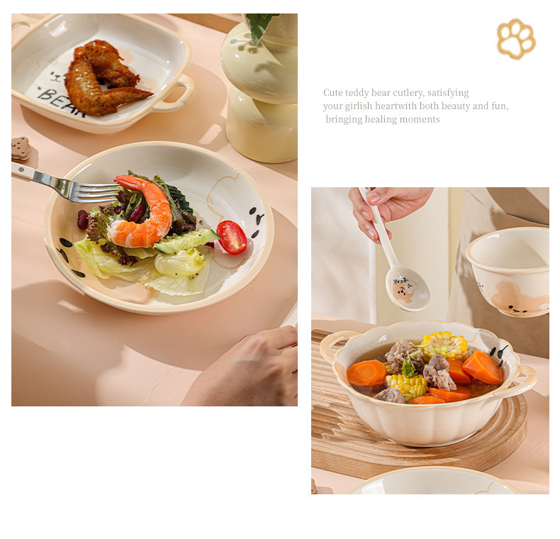 유약 컬러 만화 세라믹 그릇과 접시 식기 세트 귀여운 크림 스타일 가정용 쌀 수프 그릇 고온 방지 생선 접시