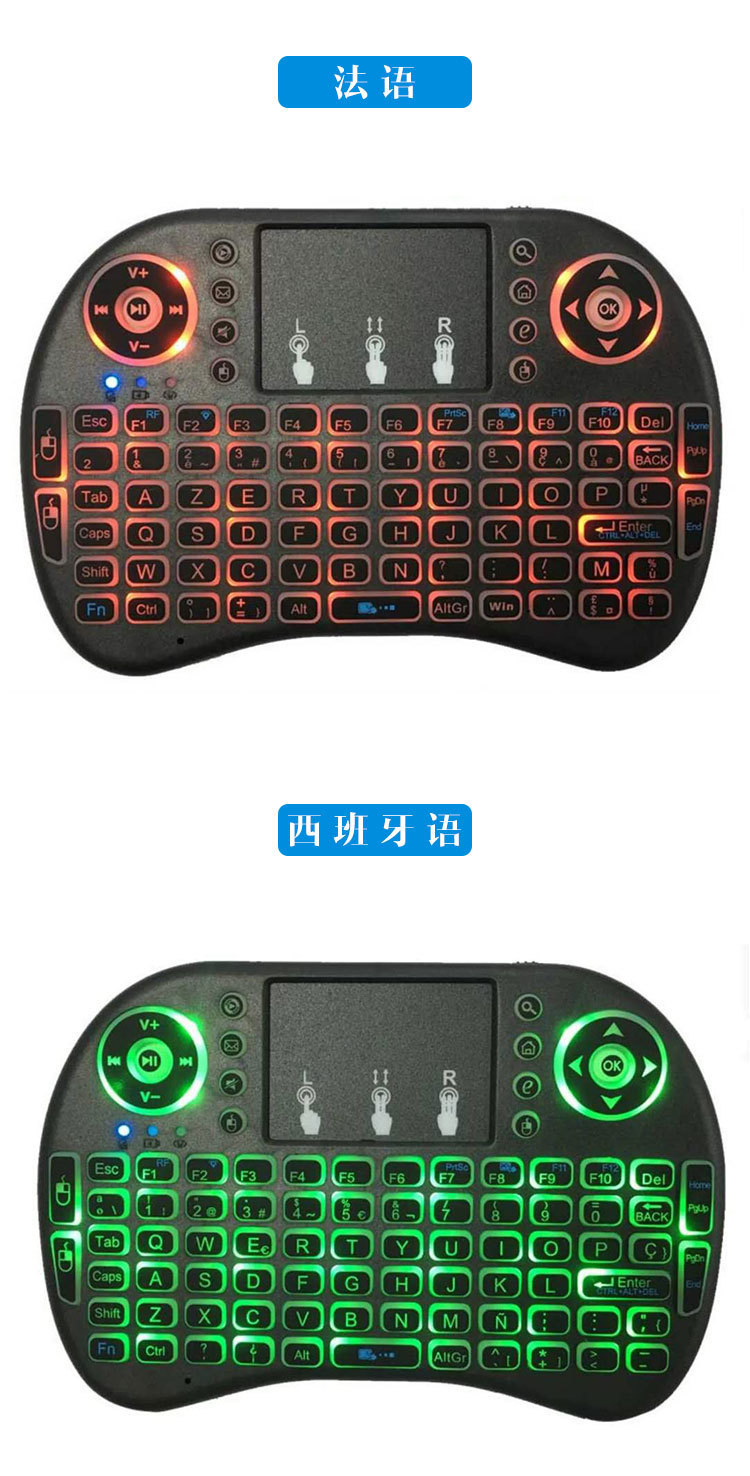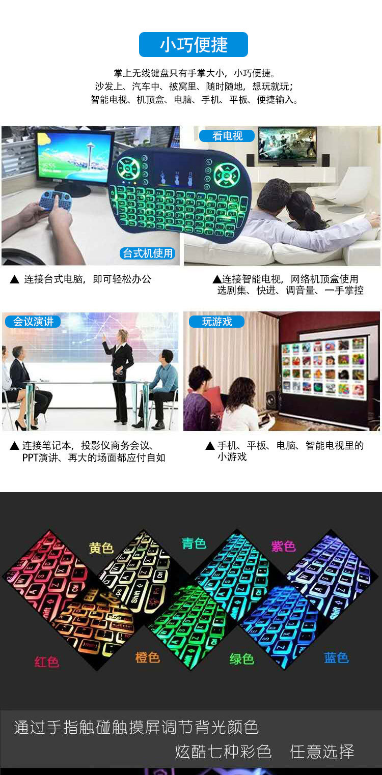 공장 직접 판매 i8 플라잉 마우스 건전지 리튬 3색 백라이트 2.4G 공중 원격 제어 무선 미니 휴대용 키보드