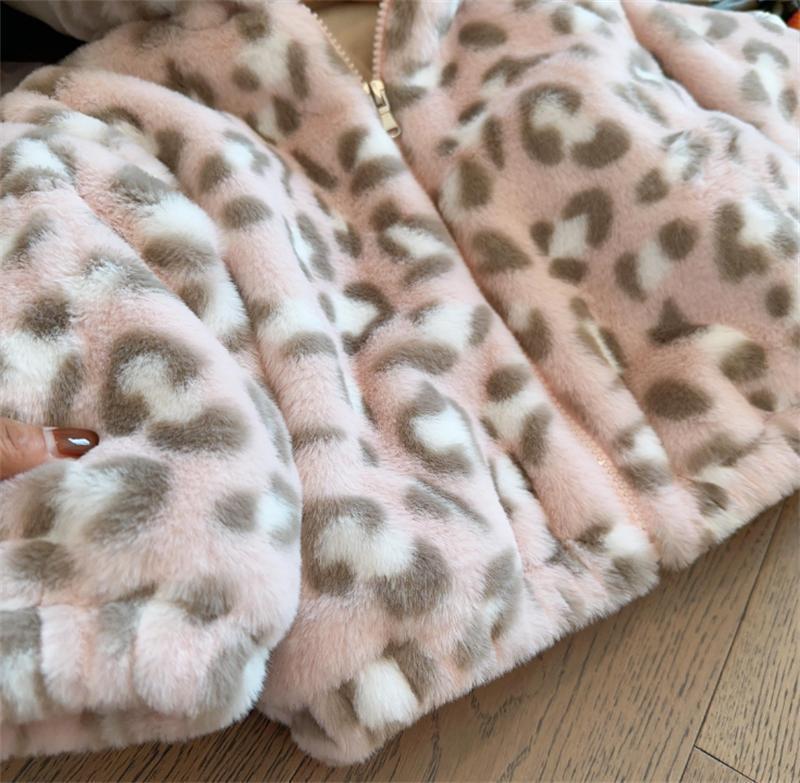 • 핑크 레오파드 프린트 벨벳 두꺼운 후드 재킷