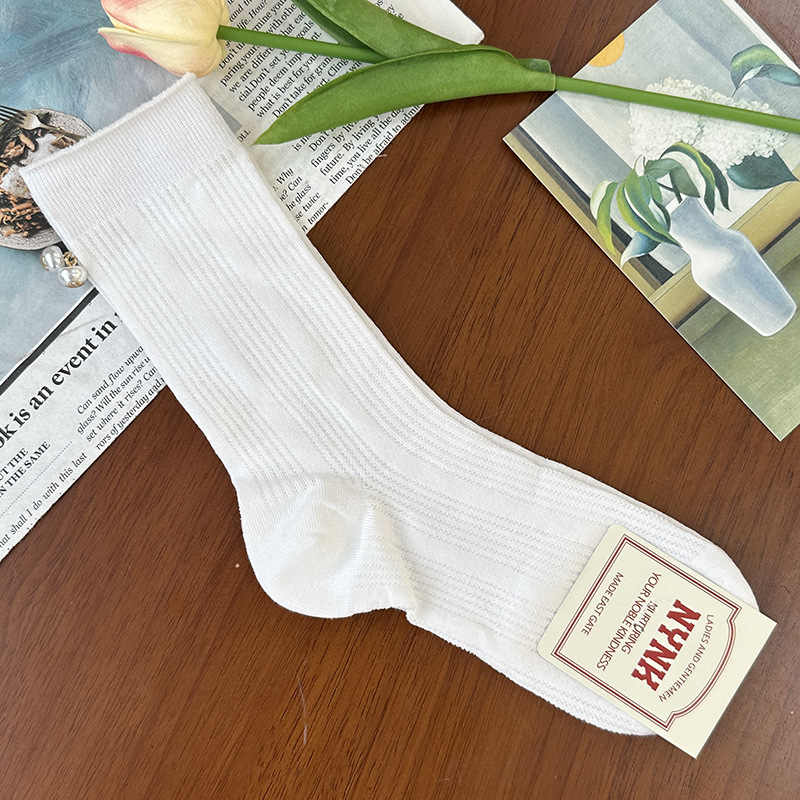 25 여름 얇은 새로운 도매 단색 수직 패턴 코튼 스택 양말 컬링 금속 진주 보석 양말 여성용 중간 튜브