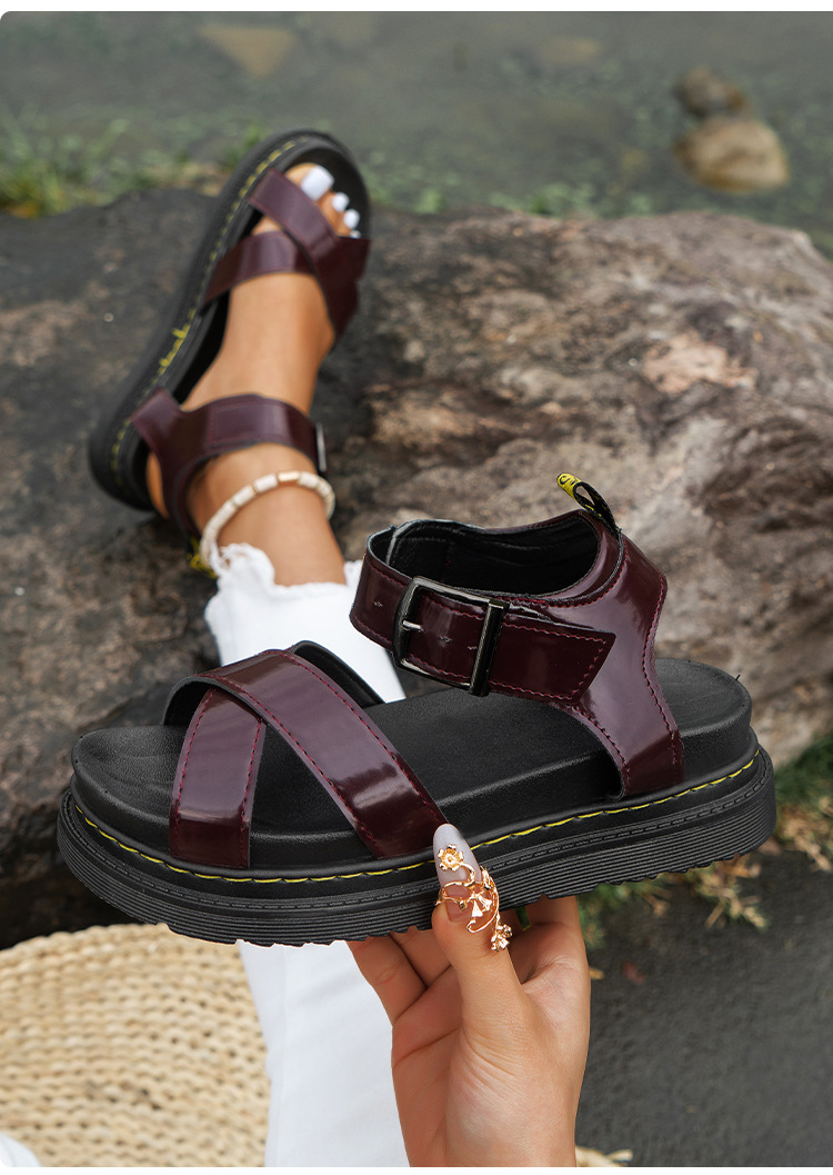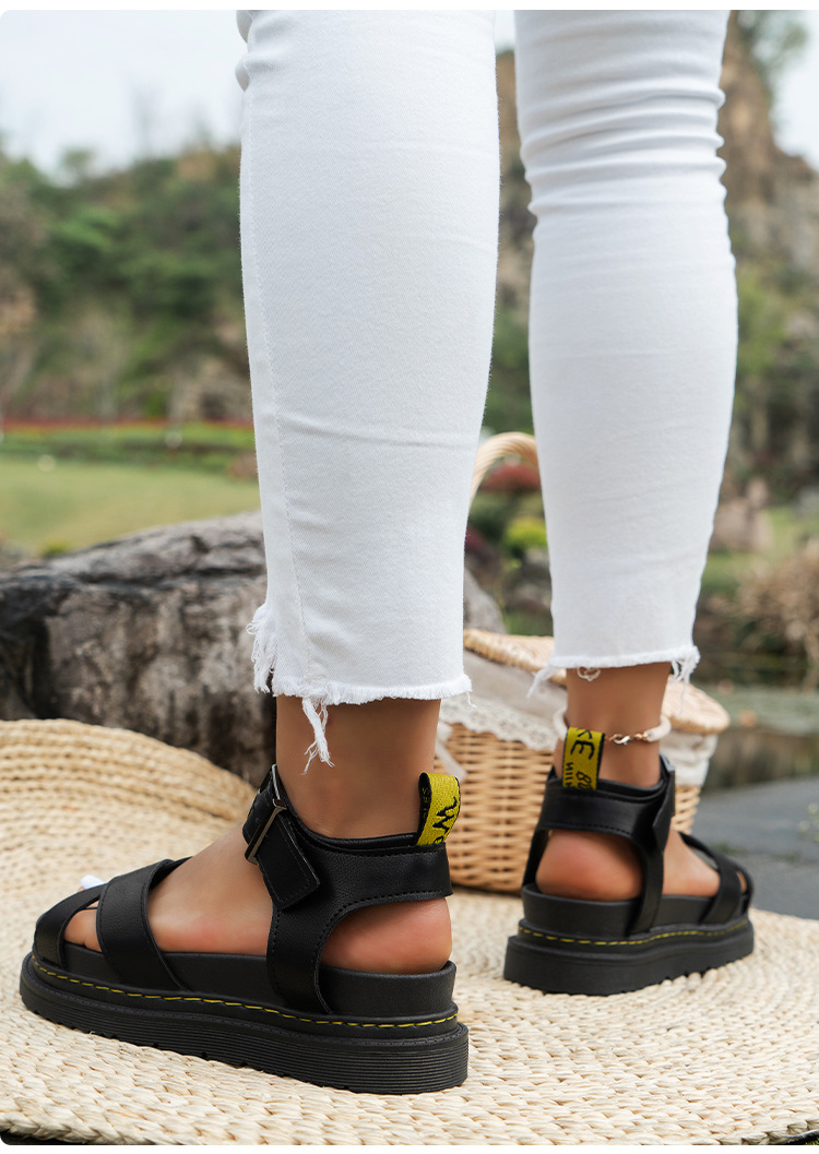 2025년 여름 신상 두꺼운 밑창 원라인 크로스 솔리드 컬러 버클 대형 중공 로마 비치 샌들 여성용 재고 있음스토어 가기