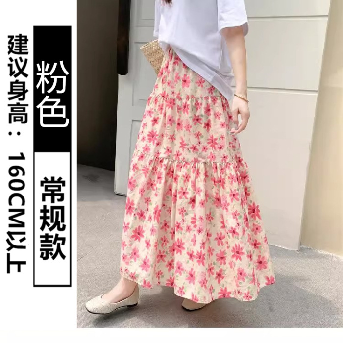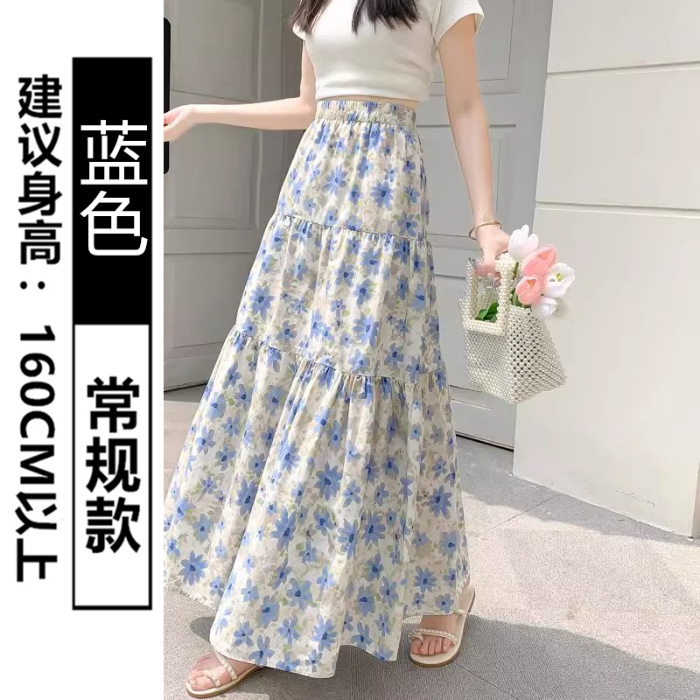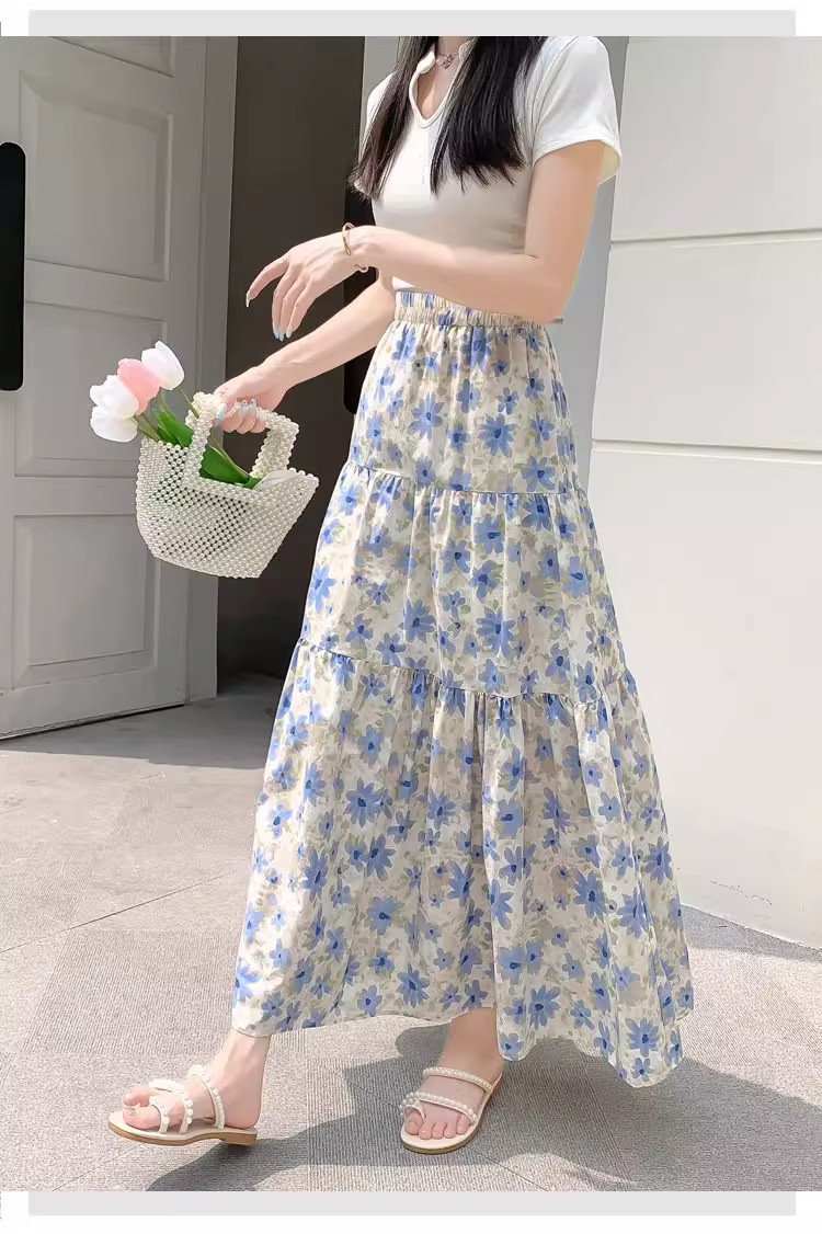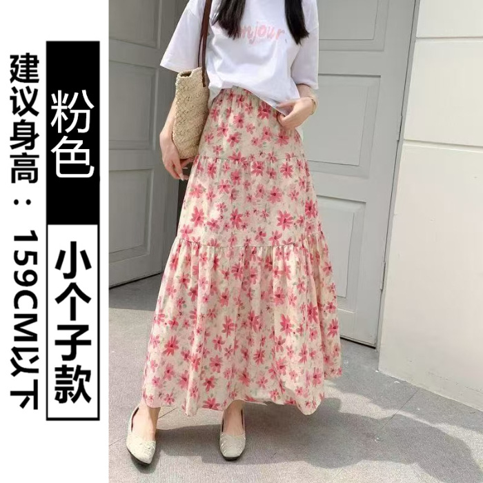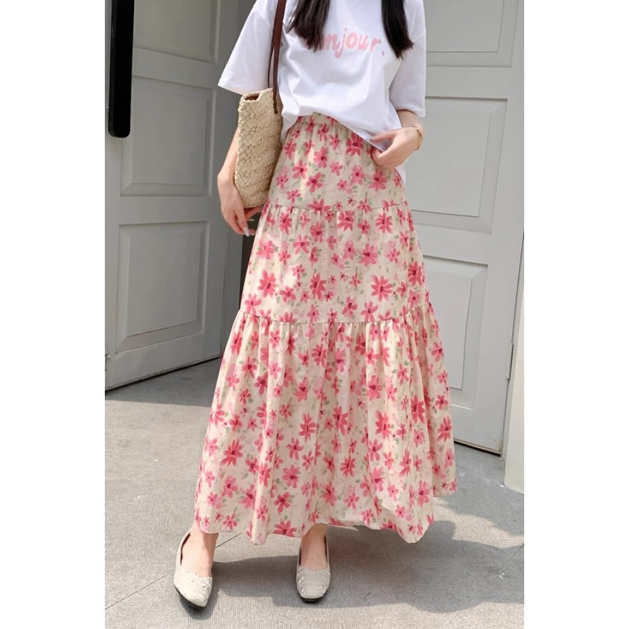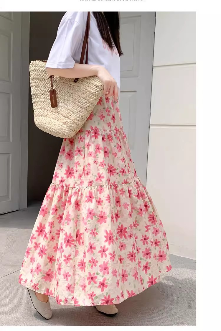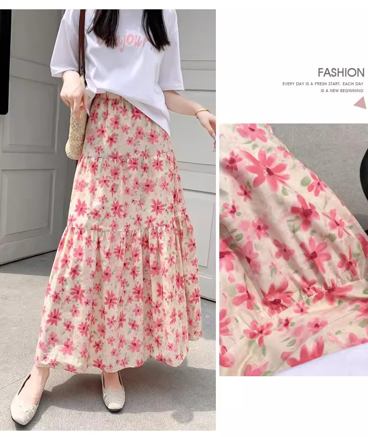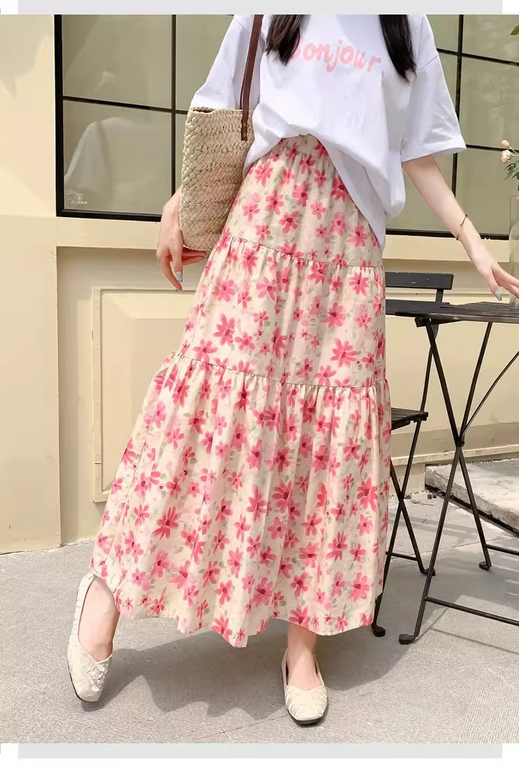 2025 하이 웨이스트 슬림 꽃 무늬 스커트 여름 얇은 신축성있는 허리 중간 길이 일본식 주름 스커트 여성용