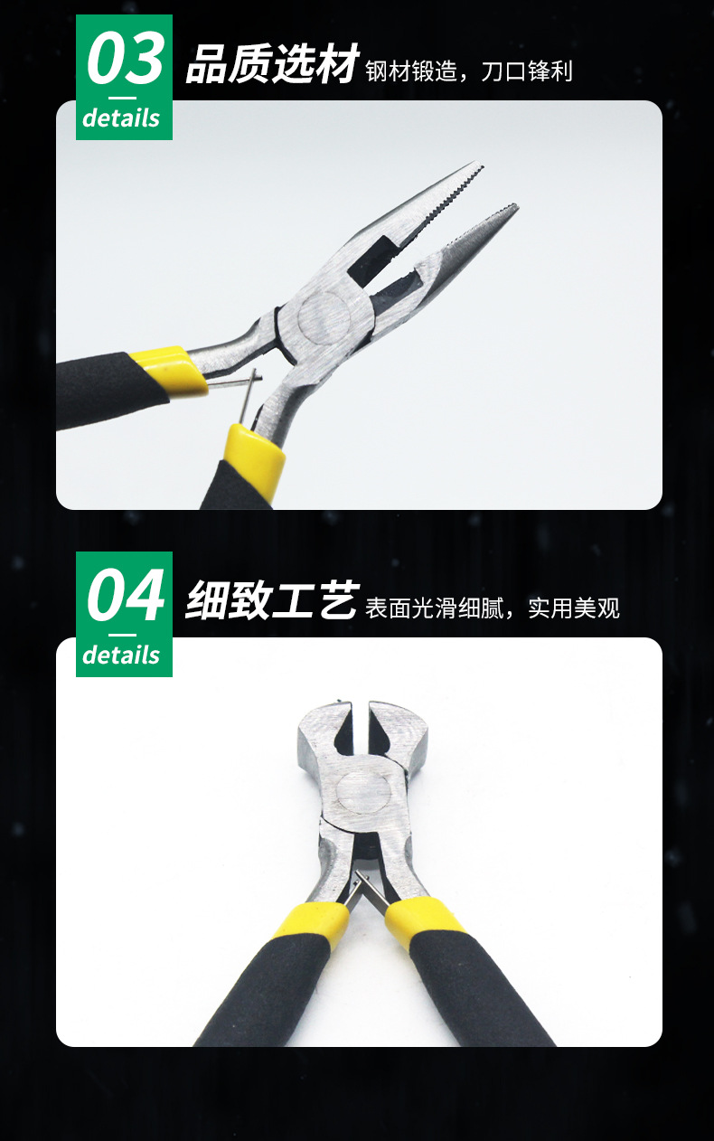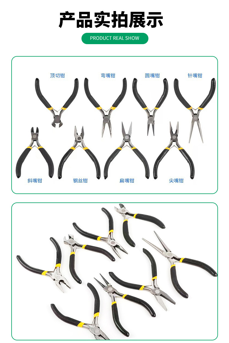 노란색과 검정색 8피스 세트, 상단 절단 펜치, 곡선형 노즈, 둥근 노즈, 바늘 노즈, 경사진 노즈, 플랫 노즈, 포인티드 노즈 펜치, 와이어 펜치, 쥬얼리 펜치스토어 가기