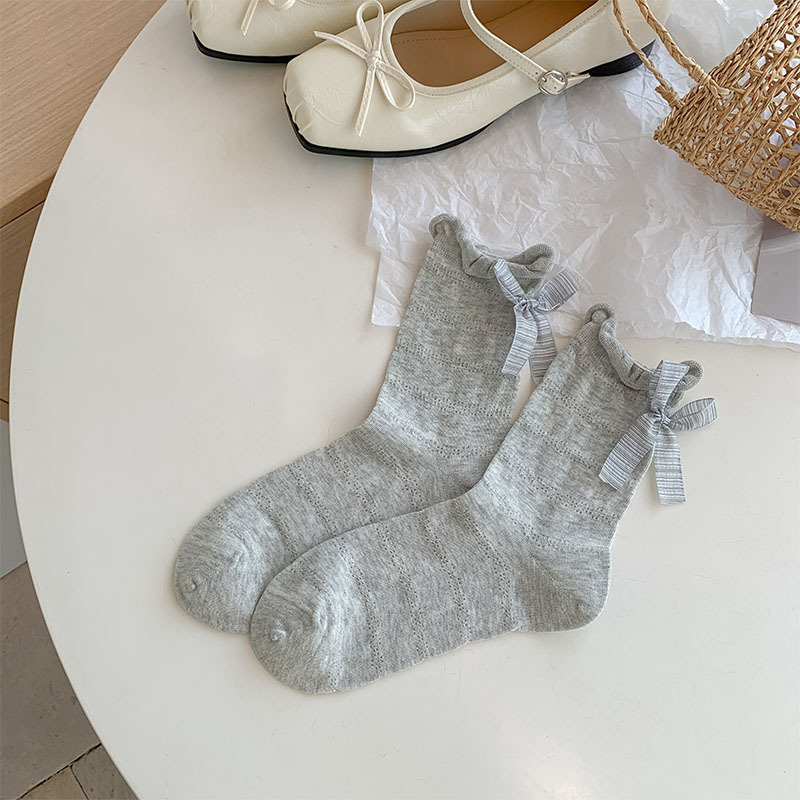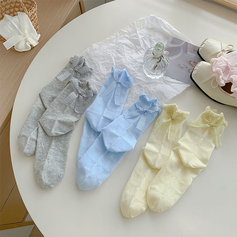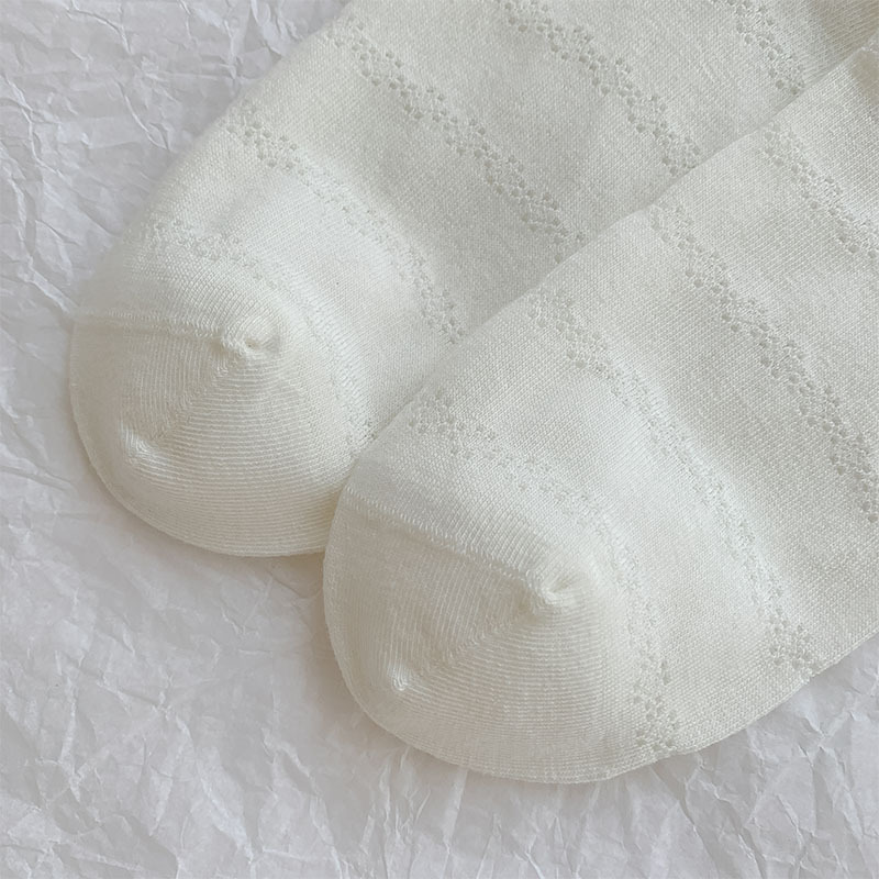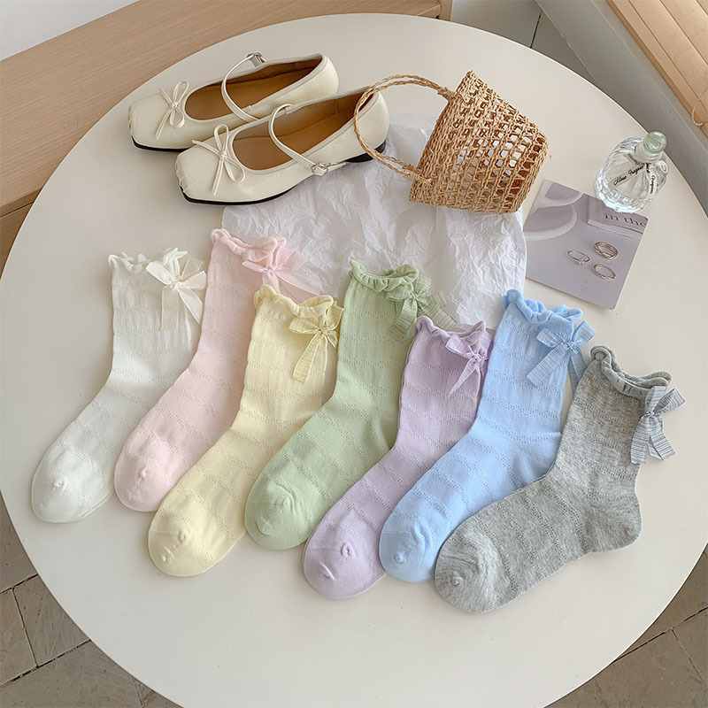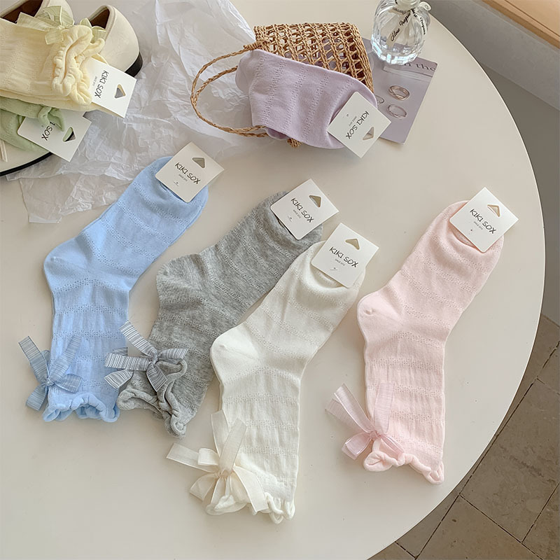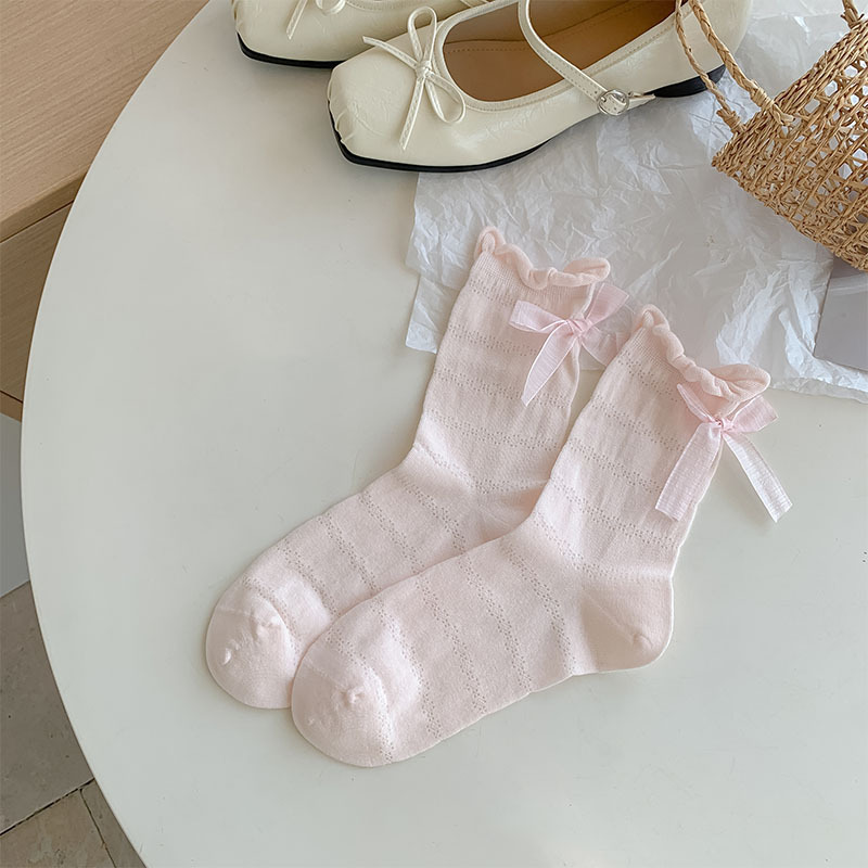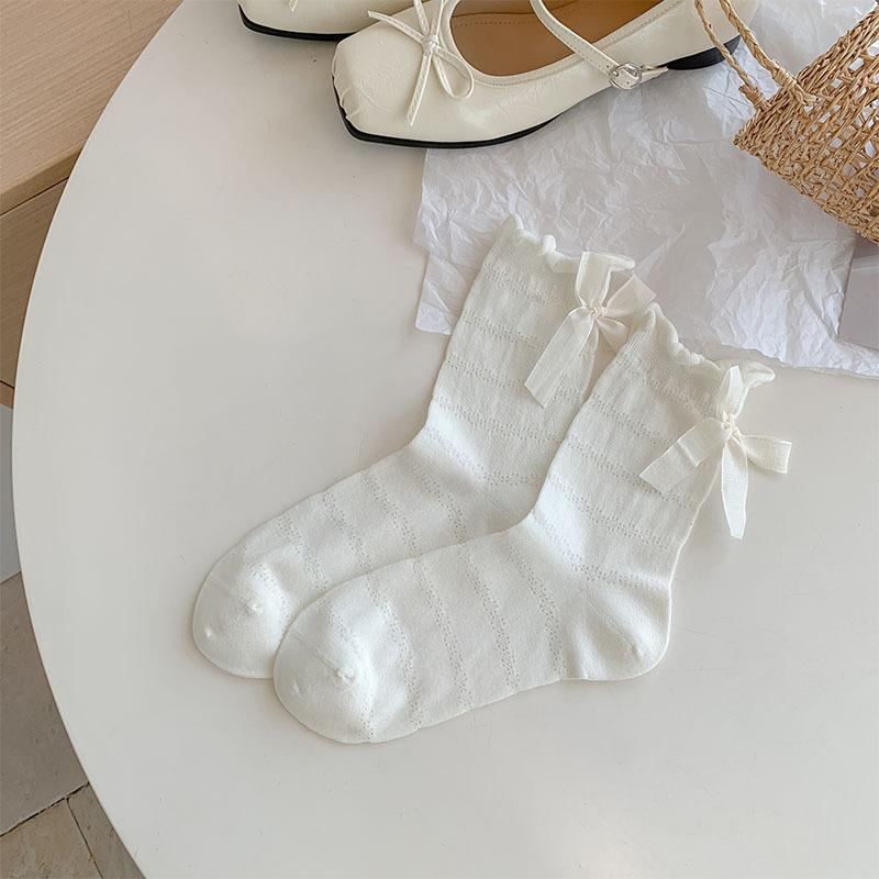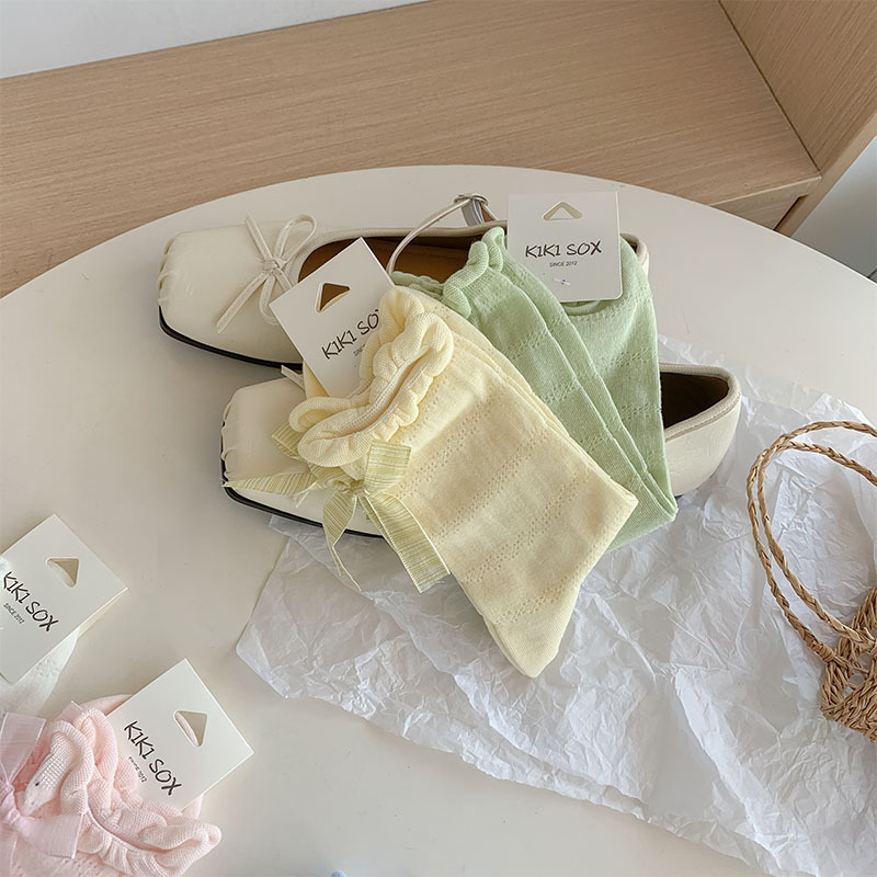 여름 여성용 크림색 달콤한 리본 양말, 얇은 일본 발레 스타일 흰색 양말과 작은 가죽 신발