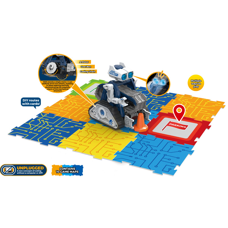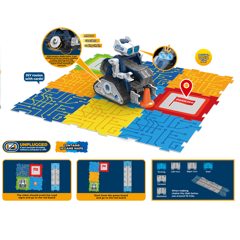 这是一个不需要IC控制就能编程的机器人,以编程链条为核心,机器人一个马达即可实现前后左右各种动作,