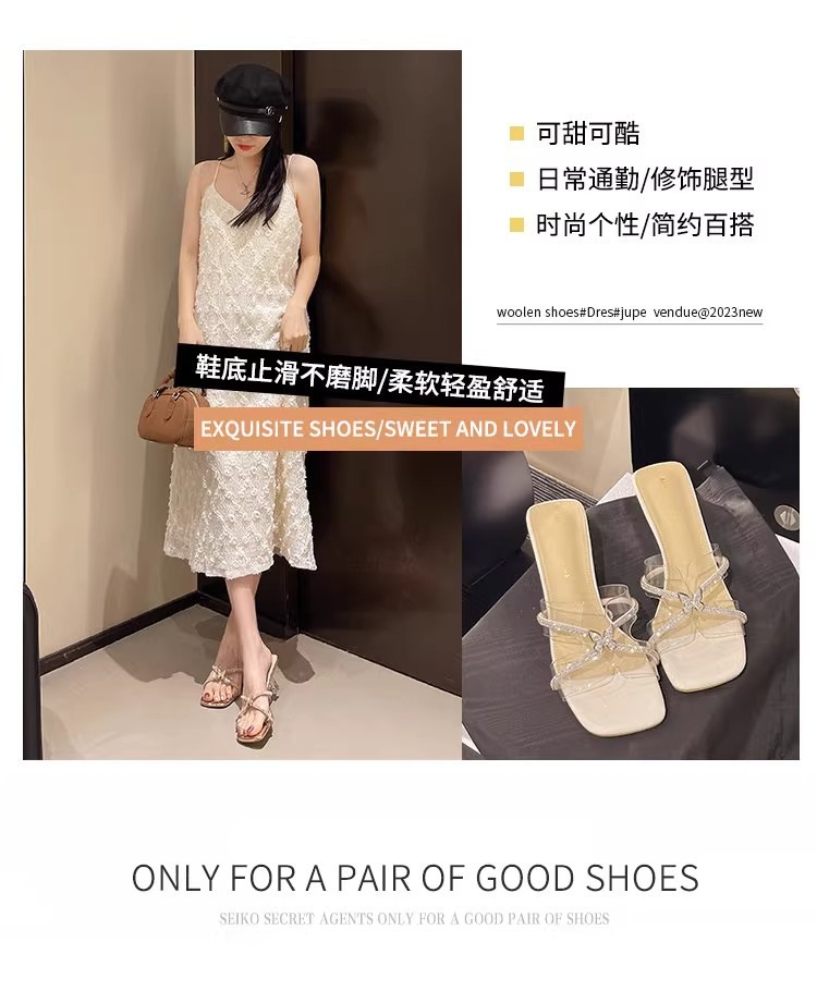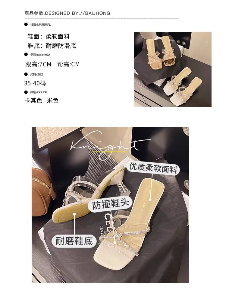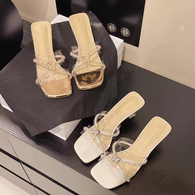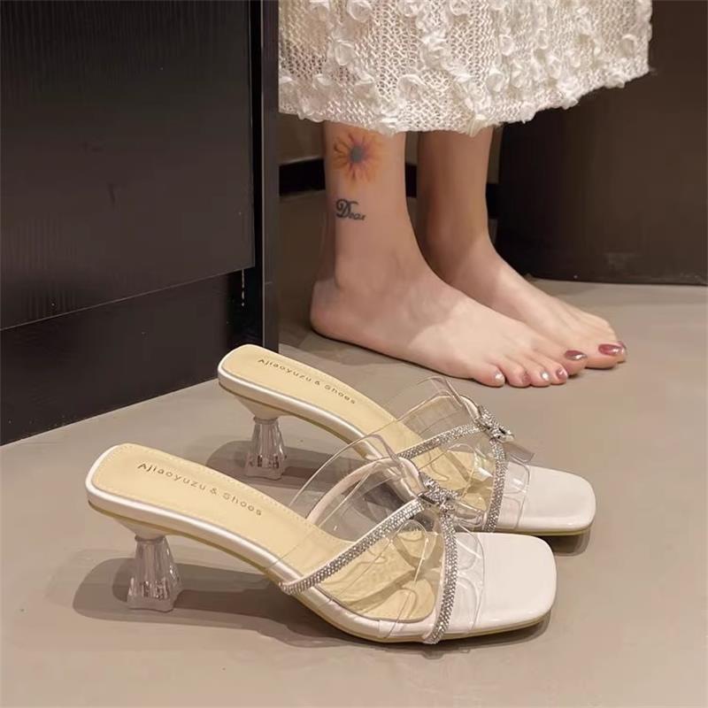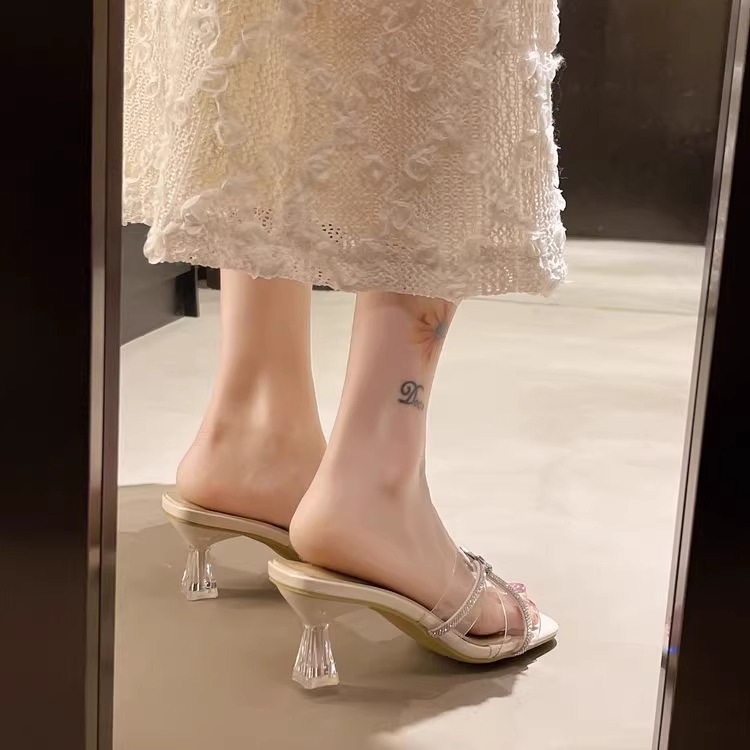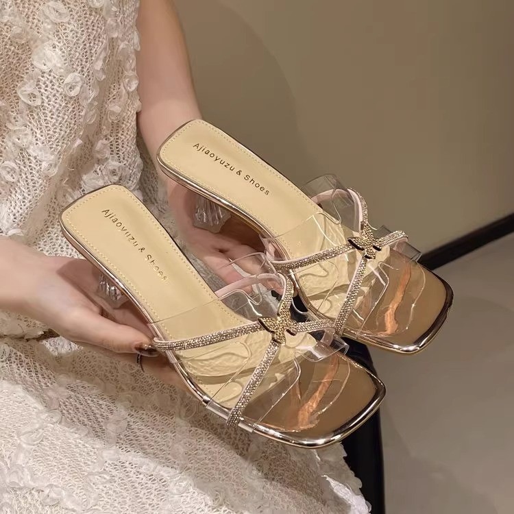 여성을위한 프랑스 크리스탈 슬리퍼 2025 새로운 여름 겉옷 세련된 투명한 두꺼운 굽 하이힐 요정 스타일 골드 샌들