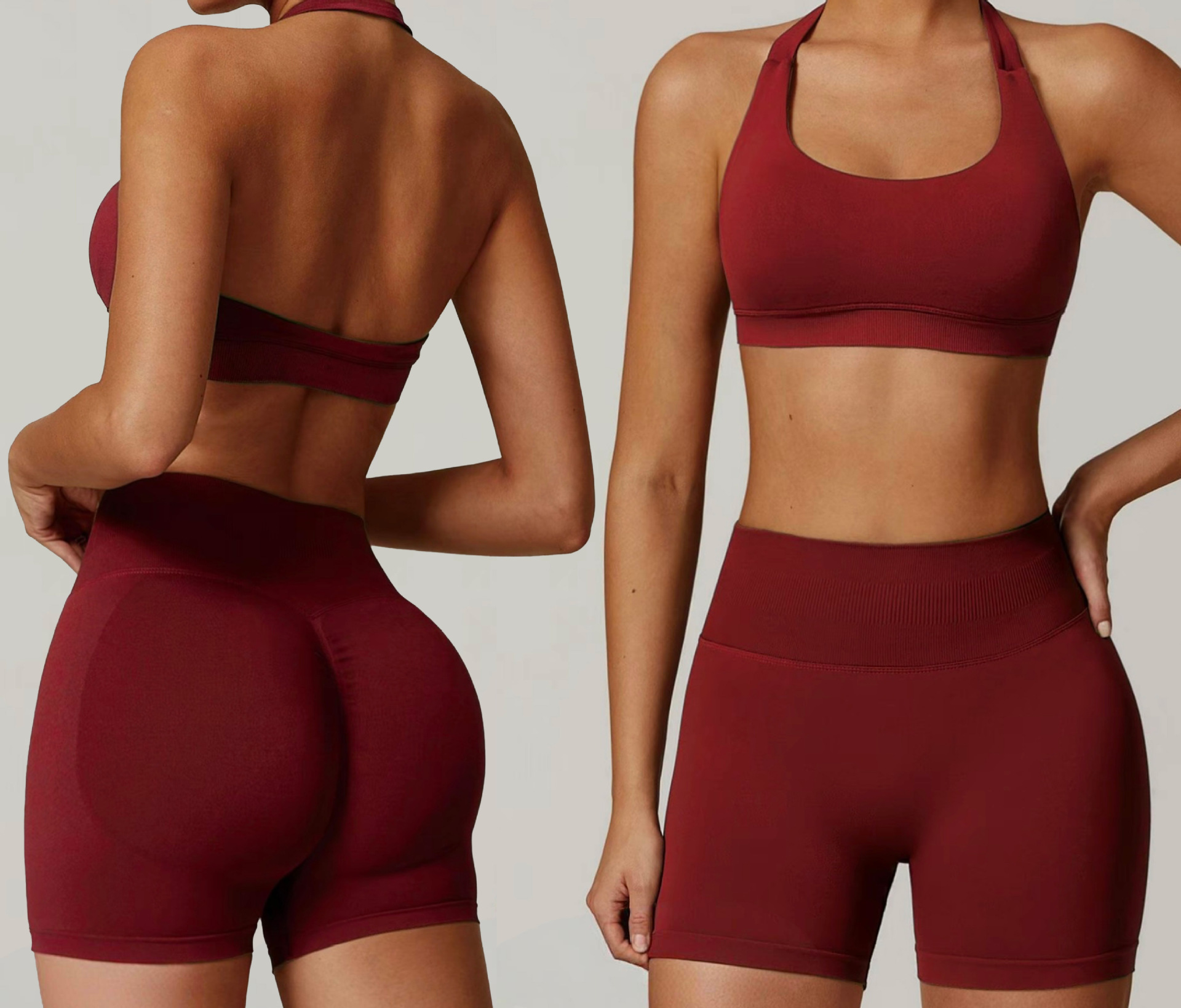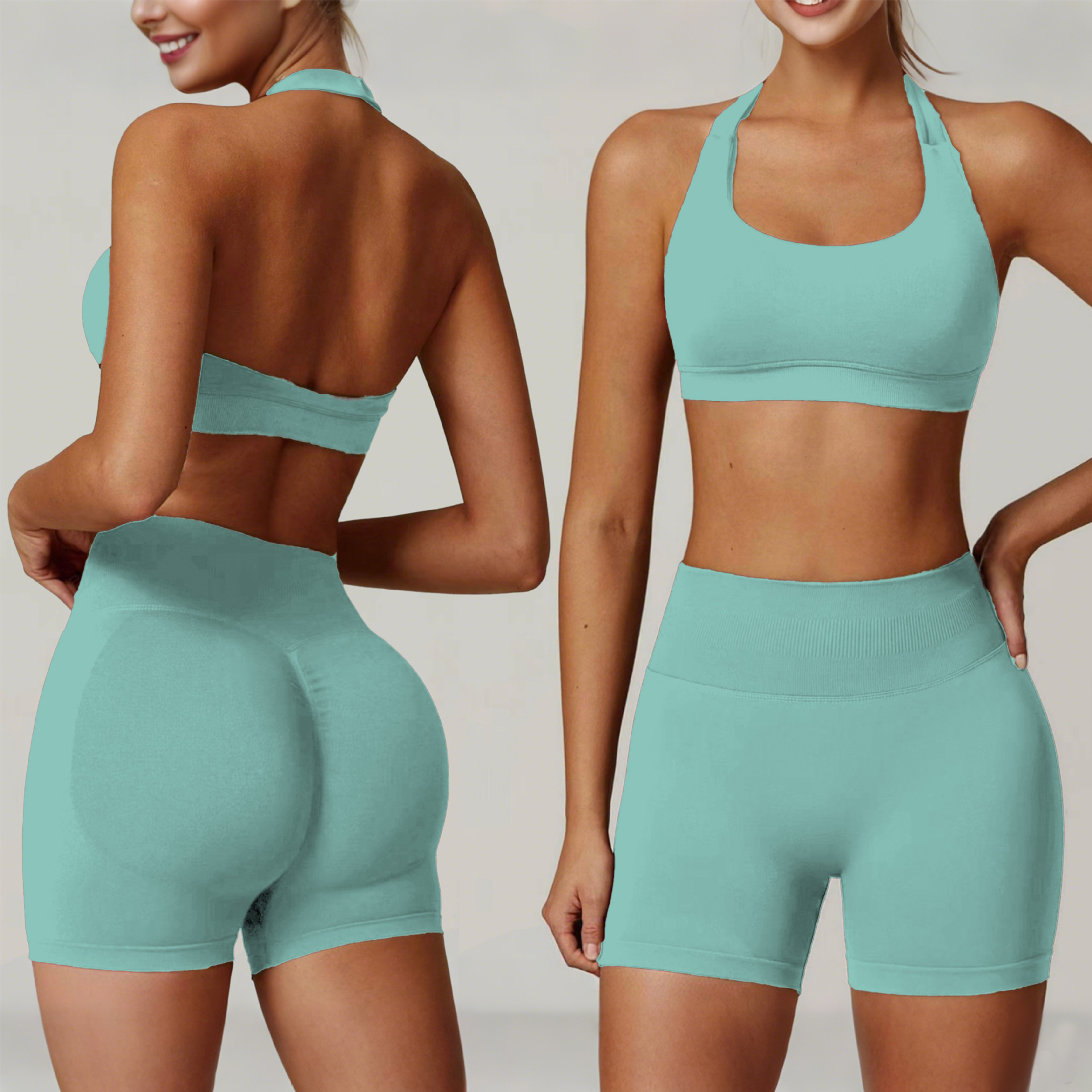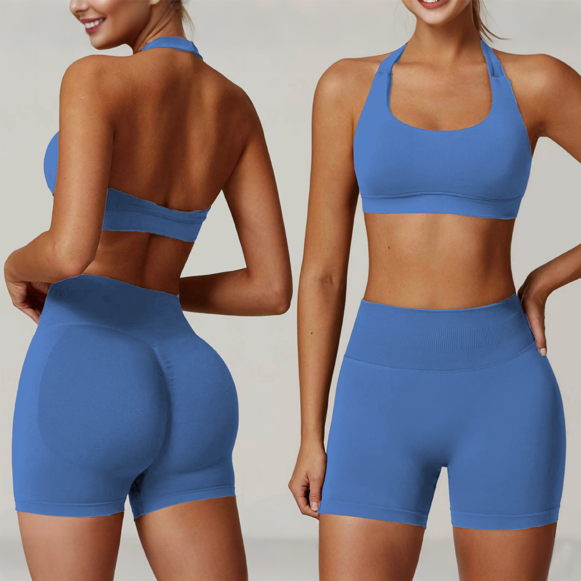 유럽식 3점 하이웨이스트 누드감 통기성 복숭아힙 리프팅 피트니스 팬츠 홀터넥 피트니스 및 뷰티백 스포츠 슈트 세트
