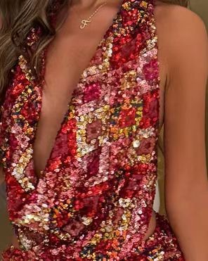 2025 유럽과 미국의 국경 간 아마존 스팽글 꽃 무늬 깊은 V 넥 홀터 탑 섹시 슬림 스커트 슈트스토어 가기