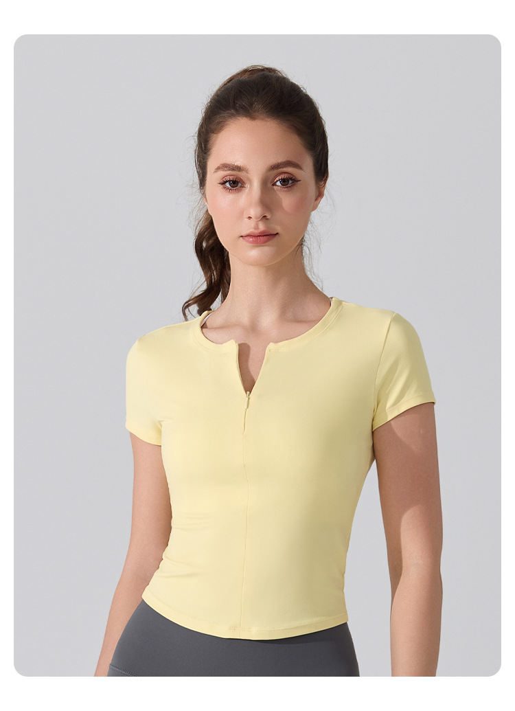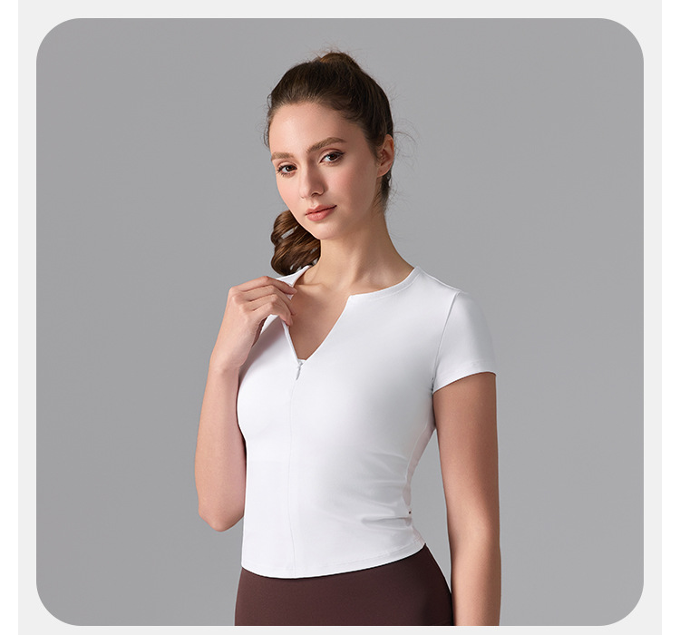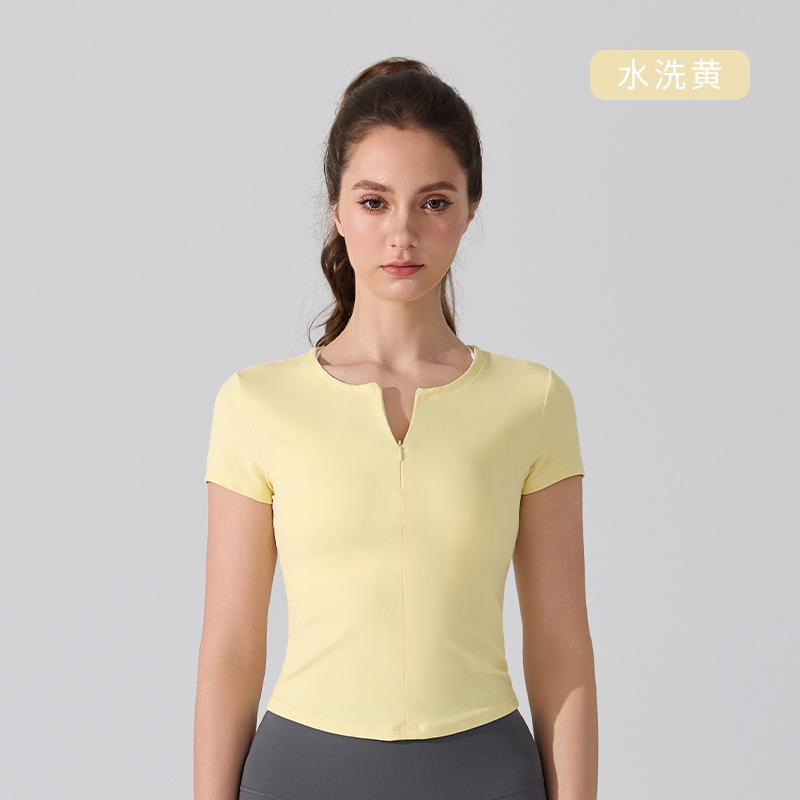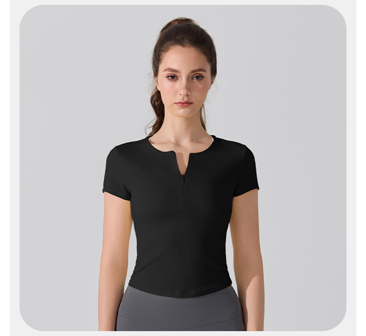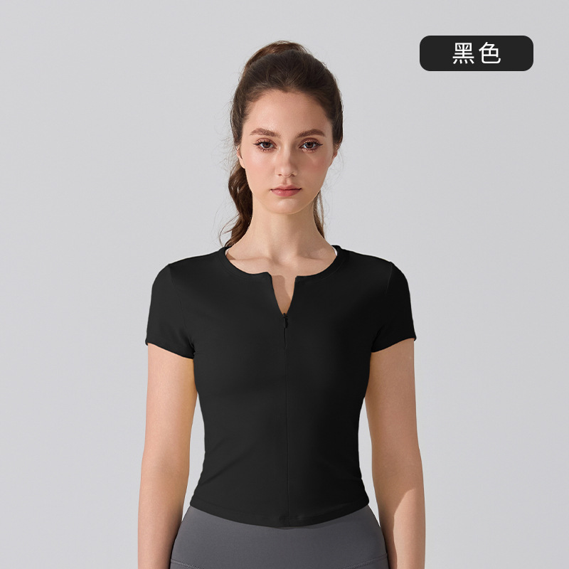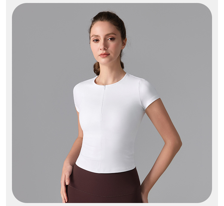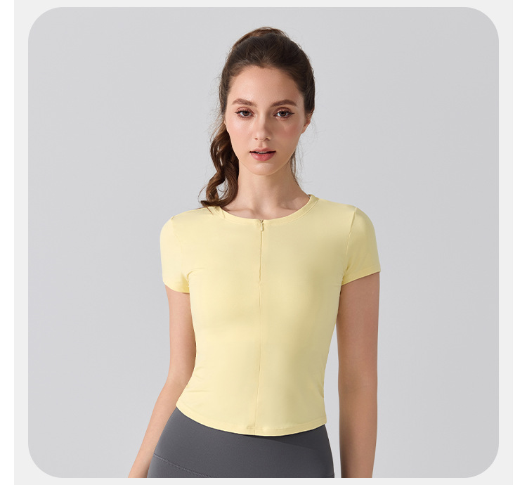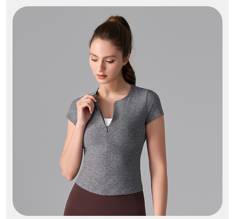 새로운 국경 간 지퍼 라운드 넥 꽉 요가 탑 반팔 짧은 스포츠 티셔츠 여성 슬림 피트니스 요가웨어스토어 가기