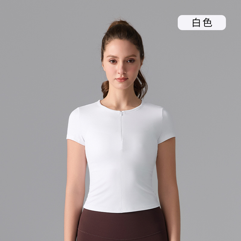 새로운 국경 간 지퍼 라운드 넥 꽉 요가 탑 반팔 짧은 스포츠 티셔츠 여성 슬림 피트니스 요가웨어