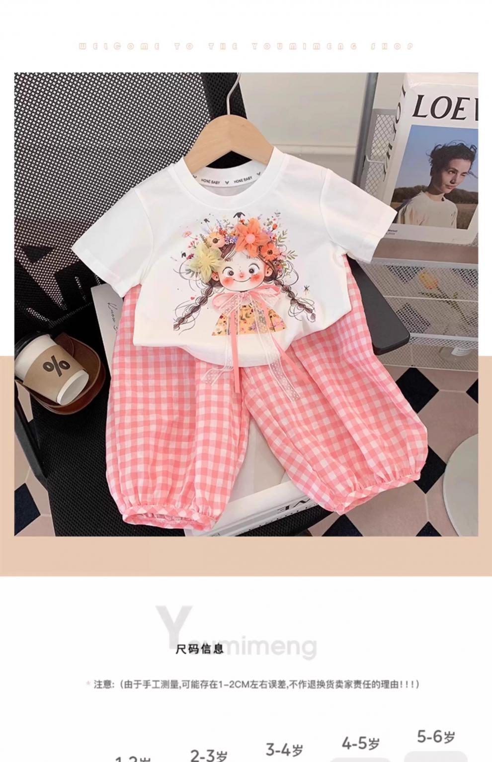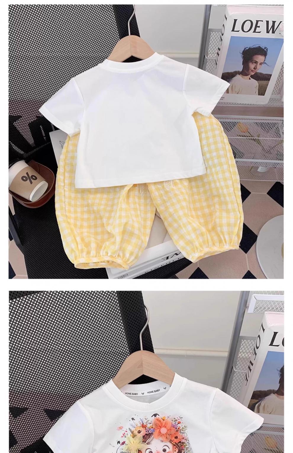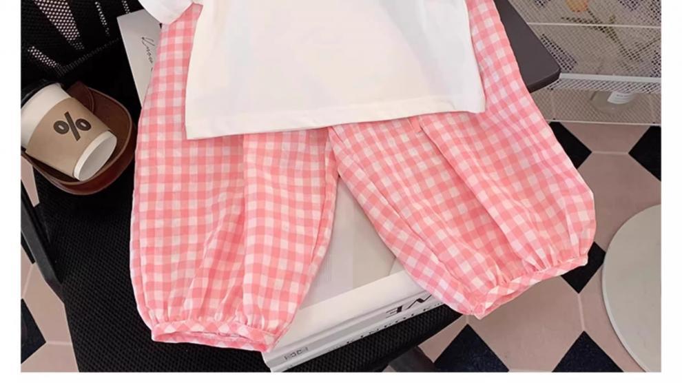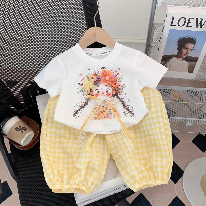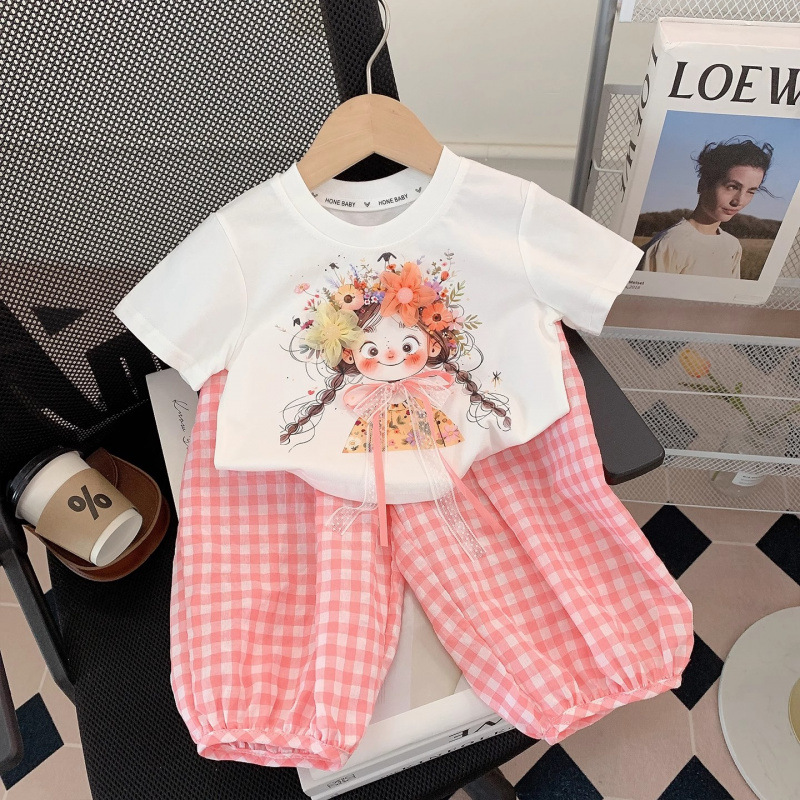 아동복, 여아 정장, 여아 여름옷, 아동용 반팔 티셔츠, 상의, 체크무늬 바지, 아동 운동복 투피스 세트