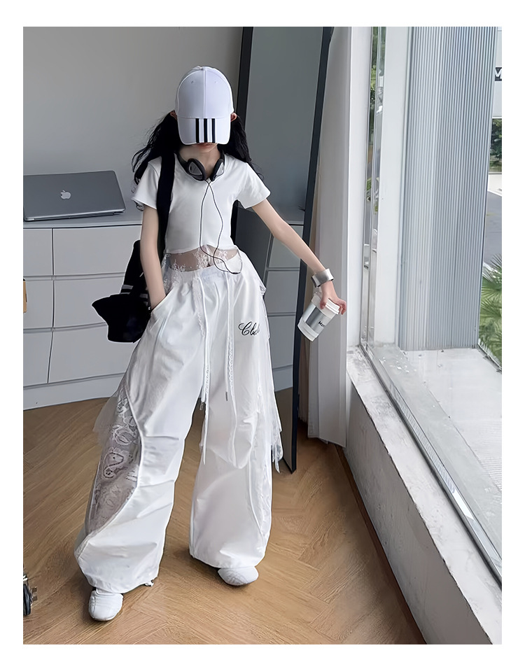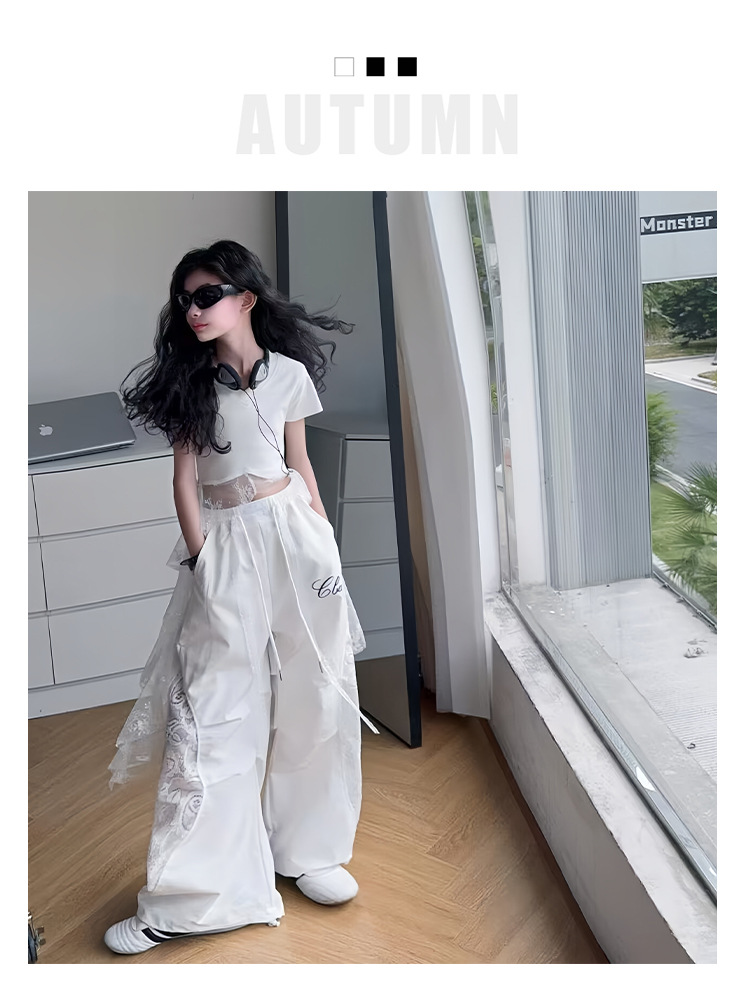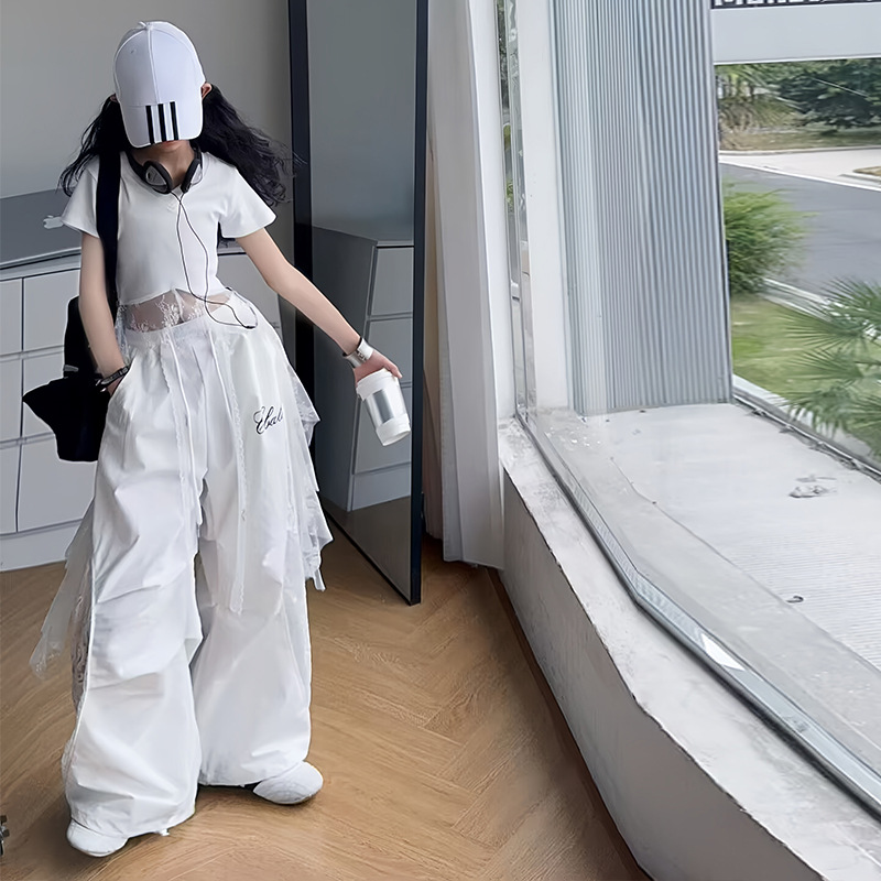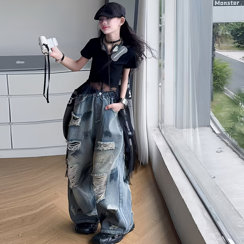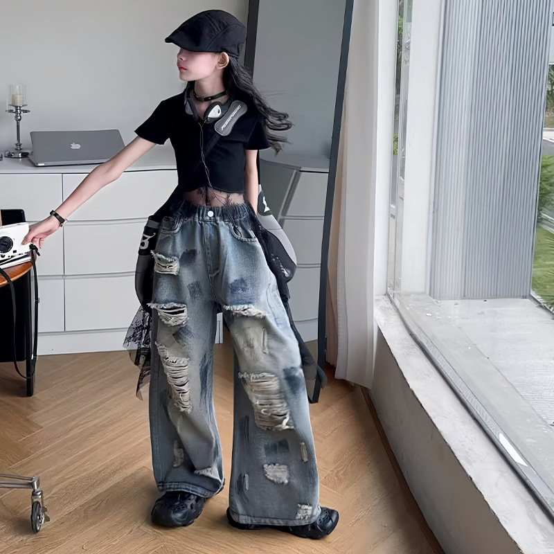 여아 레이스 스플라이스 티셔츠 세트 2025 새로운 스타일 중대형 어린이 재즈 스트리트 댄스 쿨 더티 청바지스토어 가기