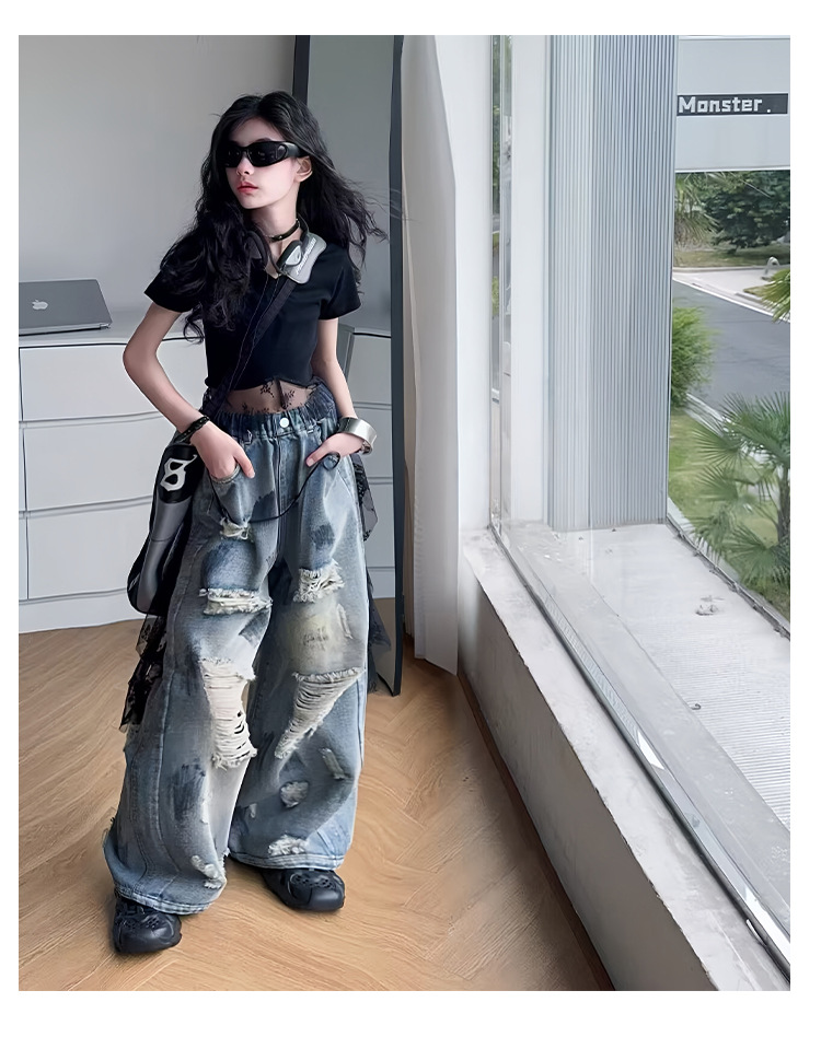 여아 레이스 스플라이스 티셔츠 세트 2025 새로운 스타일 중대형 어린이 재즈 스트리트 댄스 쿨 더티 청바지