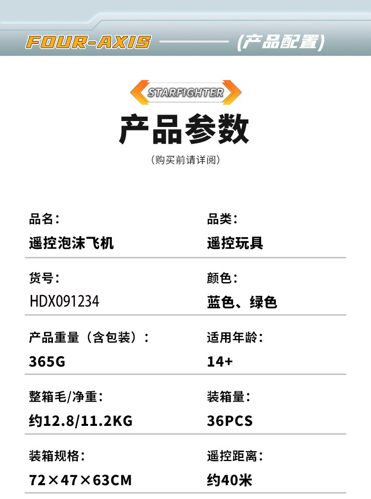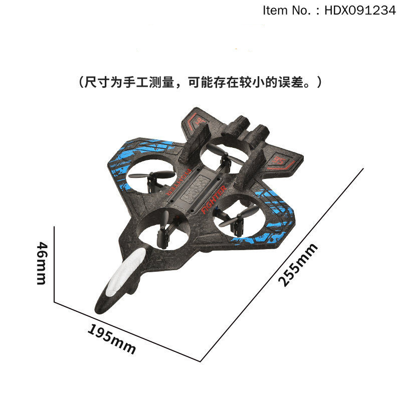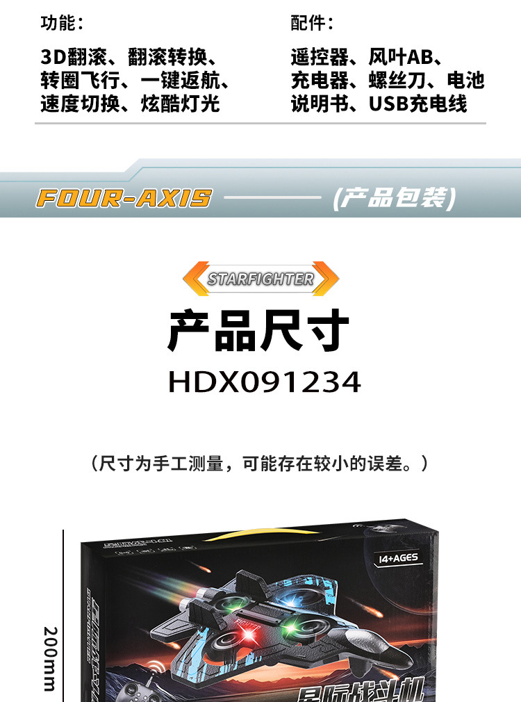 产品功能:上升/下降,左转/右转,前进/后退左右侧飞,3D翻滚,翻滚转换,无头模式,一键返航,速度切换,炫酷灯光,一键起落,无头模式,耐撞耐摔