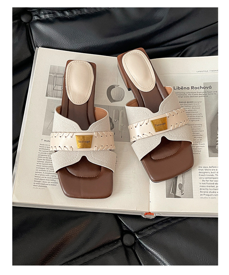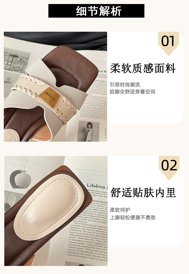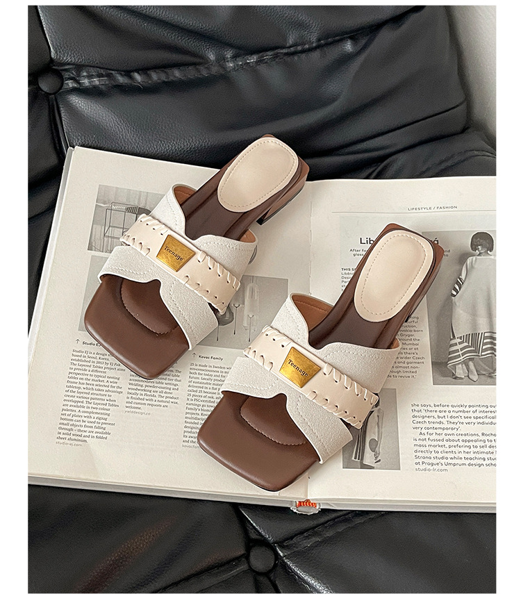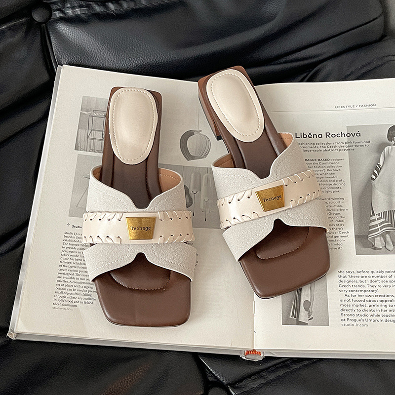 여름에 스커트 샌들과 함께 착용할 수 있는 여성용 패셔너블한 복고풍 틈새 스퀘어 토 두꺼운 굽 슬리퍼, 휴가용 웨지 샌들