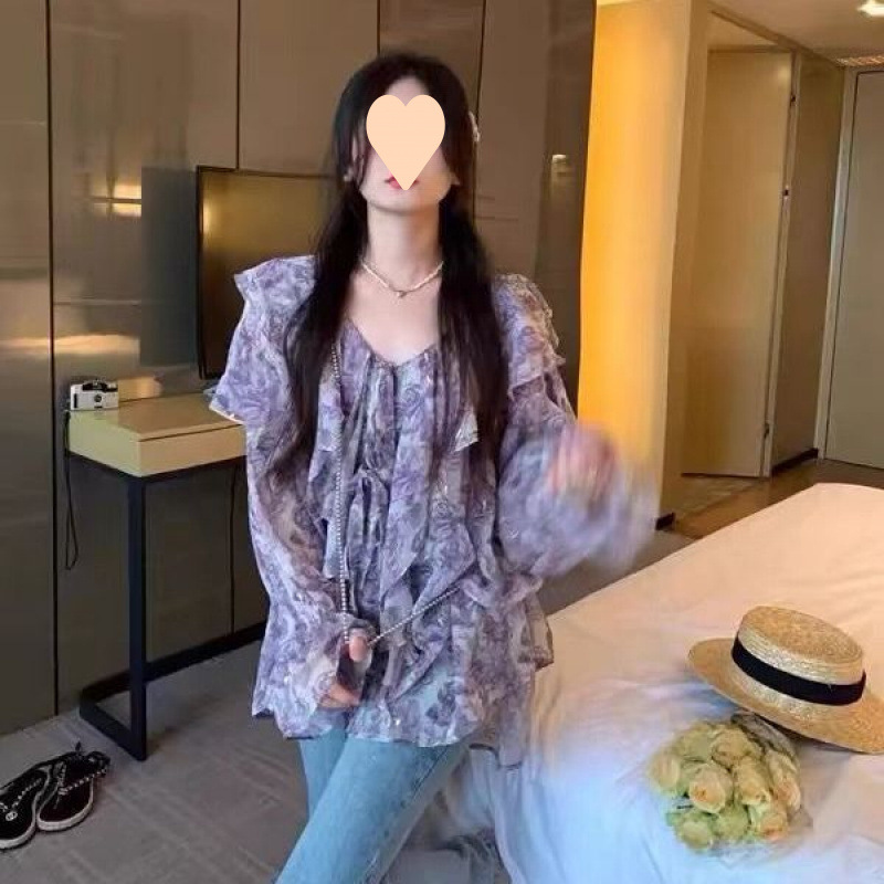 플러스 사이즈 칼라 벨 슬리브 꽃 프릴 쉬폰 셔츠 여성 봄 새로운 달콤한 느슨한 중간 길이 탑스토어 가기