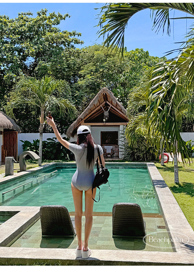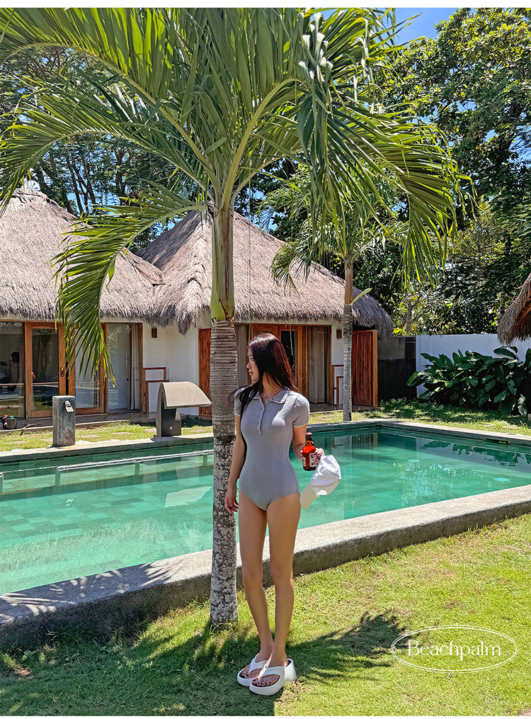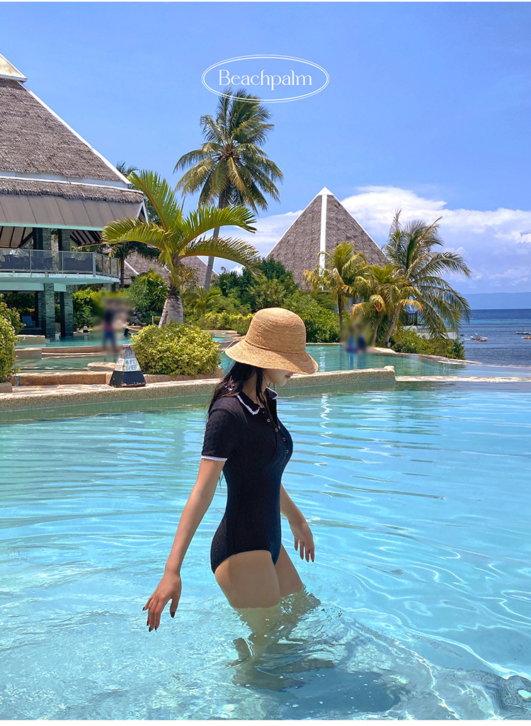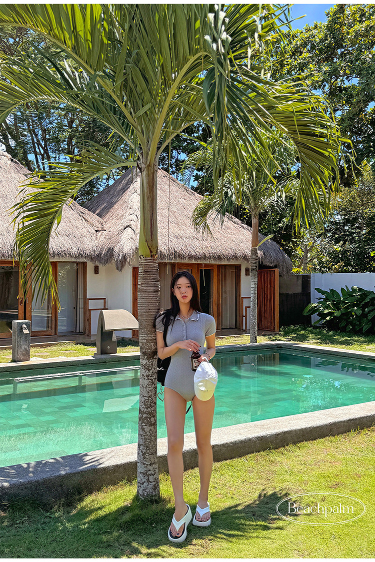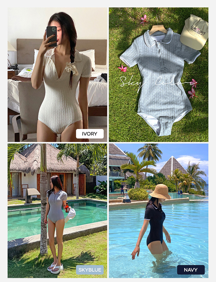 일본과 한국의 새로운 원피스 수영복 솔리드 컬러 니트 폴로 칼라 반팔 섹시 슬리밍 순수 욕망 고급 온천 수영복스토어 가기