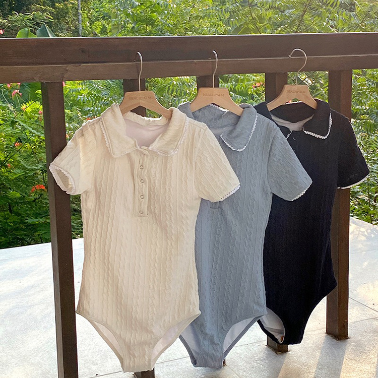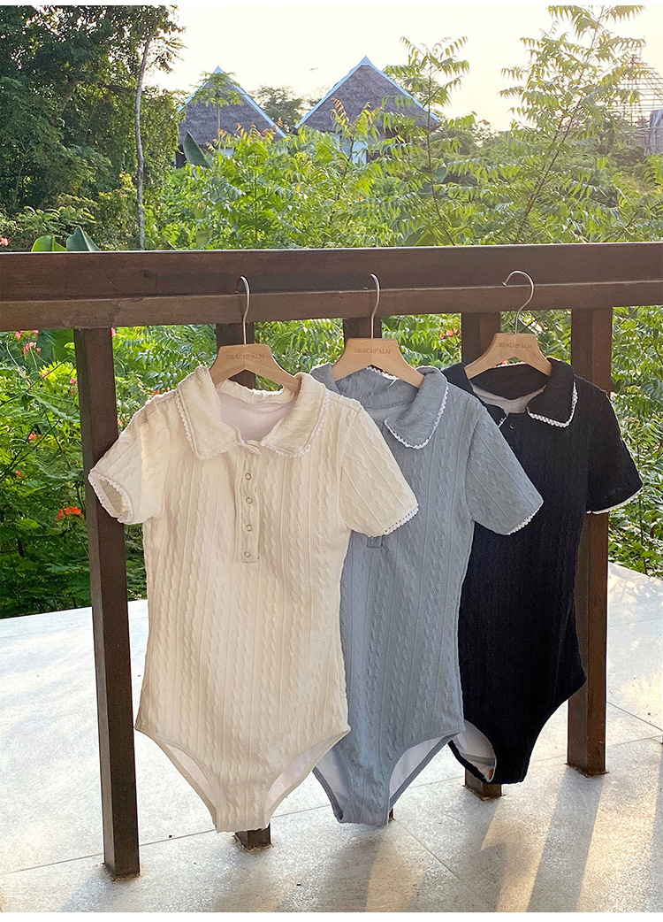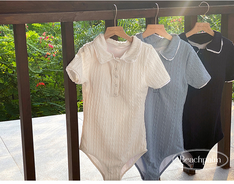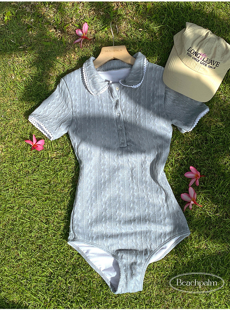 일본과 한국의 새로운 원피스 수영복 솔리드 컬러 니트 폴로 칼라 반팔 섹시 슬리밍 순수 욕망 고급 온천 수영복