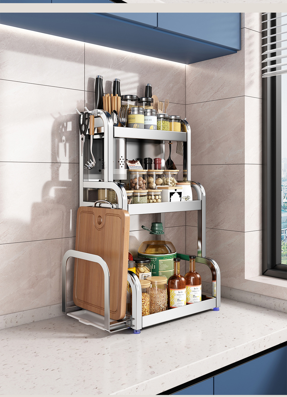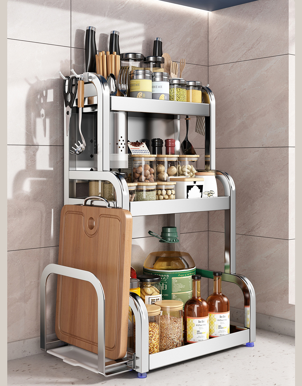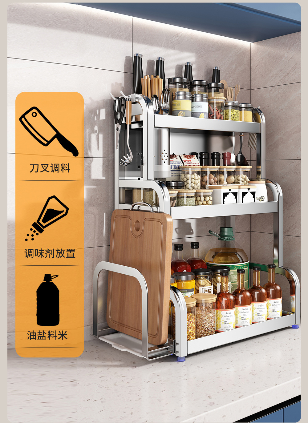 스테인리스 주방 수납 선반, 조리대에 기름통, 양념통, 칼, 젓가락 등을 다층으로 보관할 수 있는 조미료 수납 선반, 칼꽂이