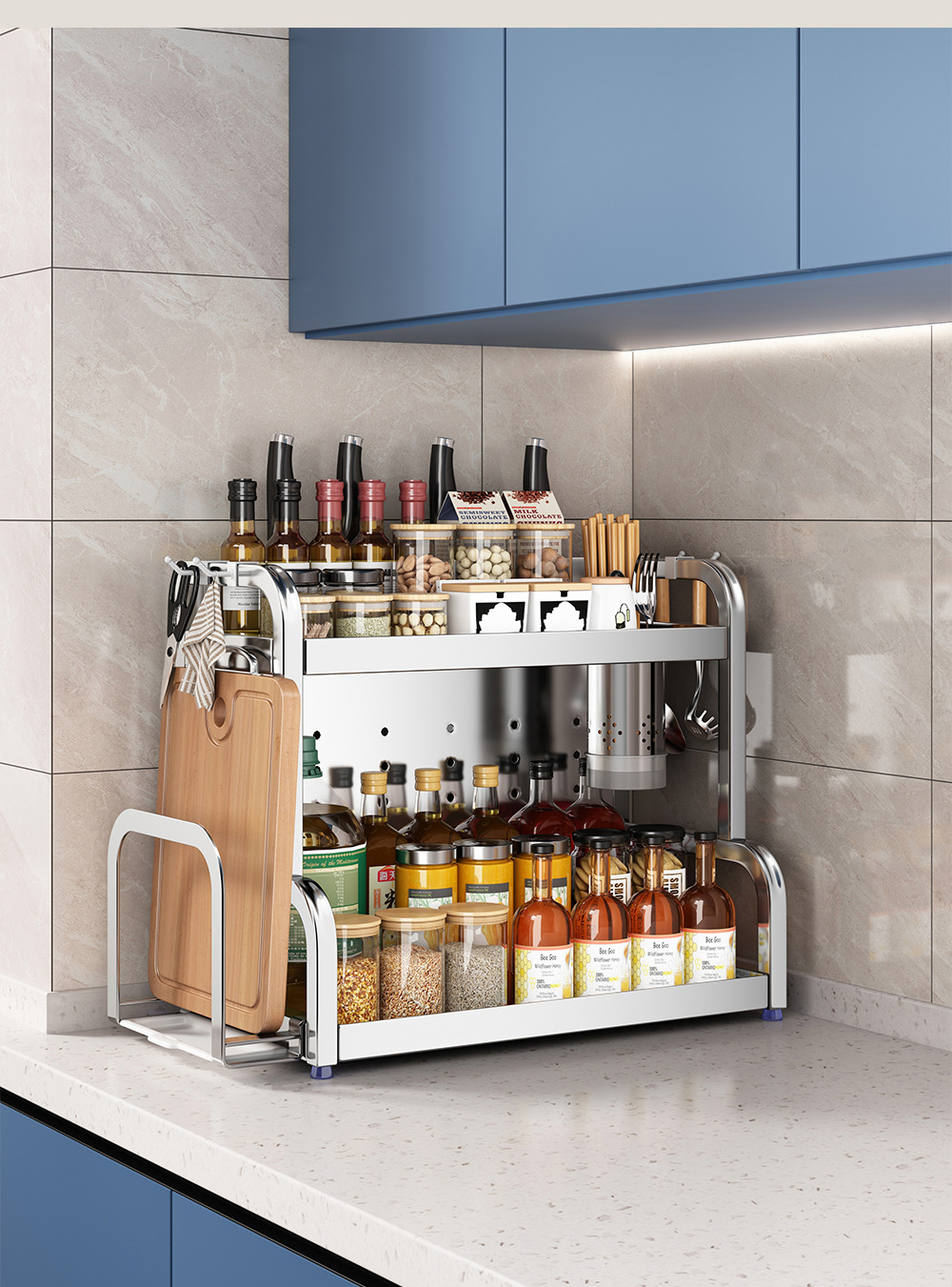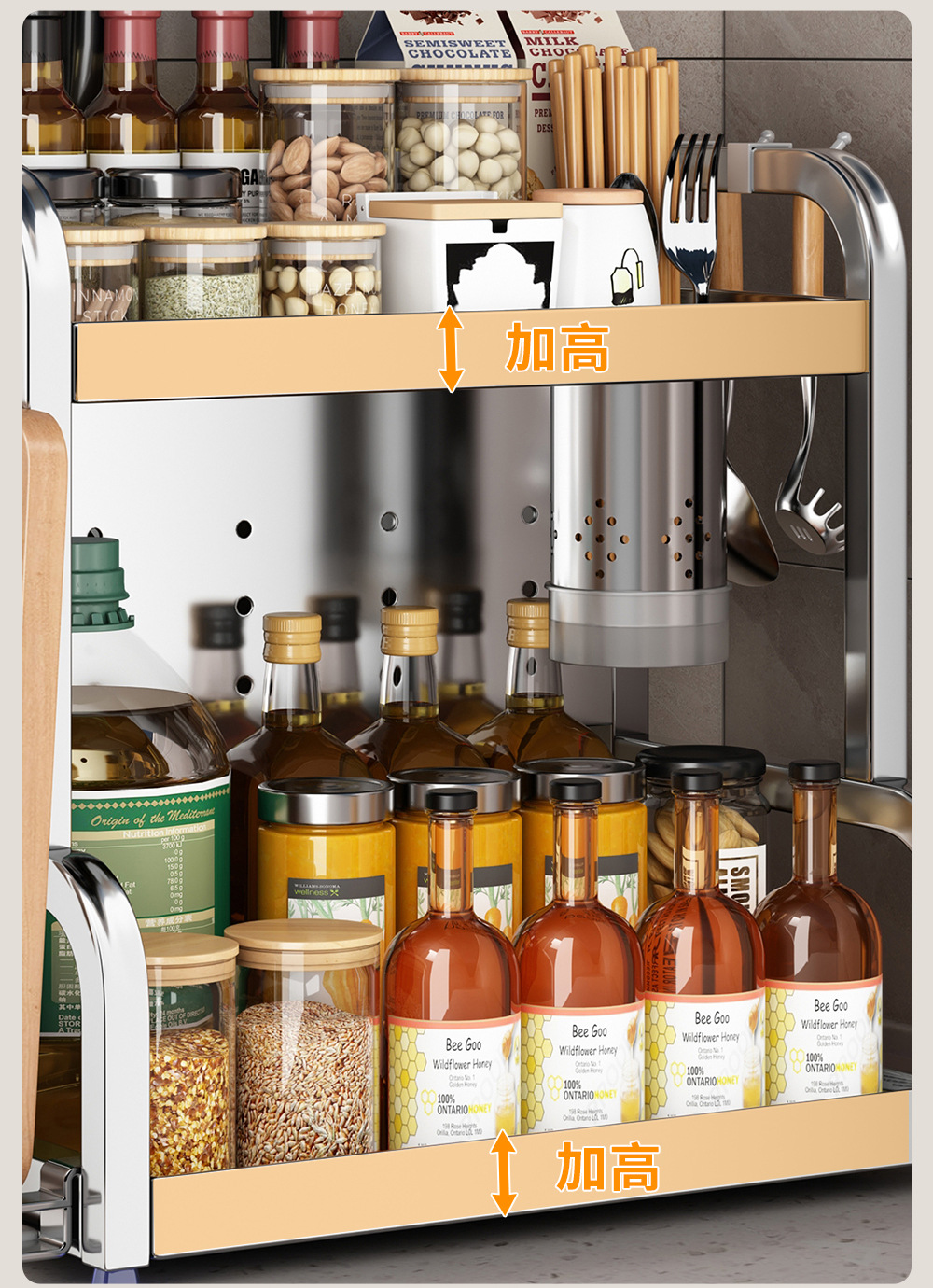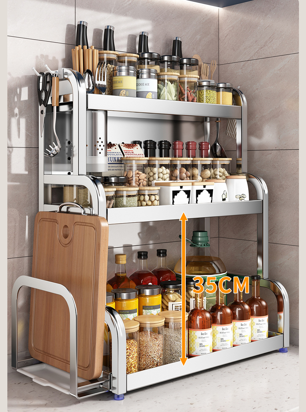 스테인리스 주방 수납 선반, 조리대에 기름통, 양념통, 칼, 젓가락 등을 다층으로 보관할 수 있는 조미료 수납 선반, 칼꽂이
