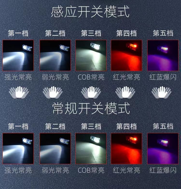 开关档位 主灯强光-主灯弱光-COB强光-红光-红蓝爆闪