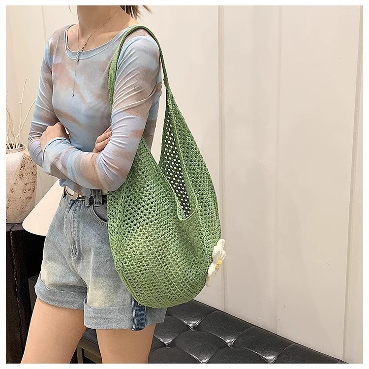 여성을위한 휴가 짠 가방 2025 새로운 한국어 스타일 어깨 토트 백 게으른 스타일 니트 중공 꽃 비치 가방