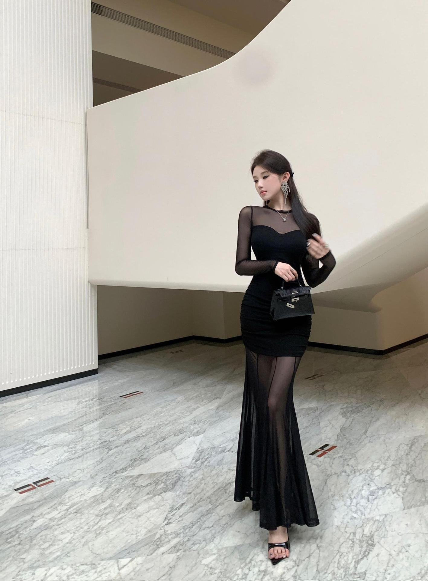 2025 봄 새로운 스타일 프랑스 스타일 여왕 자매 하이 엔드 이브닝 드레스 레이디 블랙 메쉬 긴팔 드레스 여성용