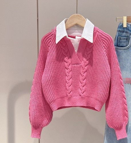 대외 무역 소녀 가짜 투피스 스웨터 정장 가을, 겨울 2025 새로운 한국 스타일 큰 어린이 소녀 니트 스웨터 가을 탑스토어 가기