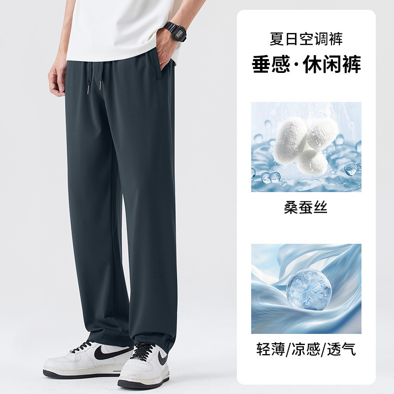 고급 뽕나무 실크 남성 캐주얼 팬츠 2026 여름 얇은 아이스 실크 스트레이트 루즈핏 드레이프 엘라스틱 허리 롱 팬츠