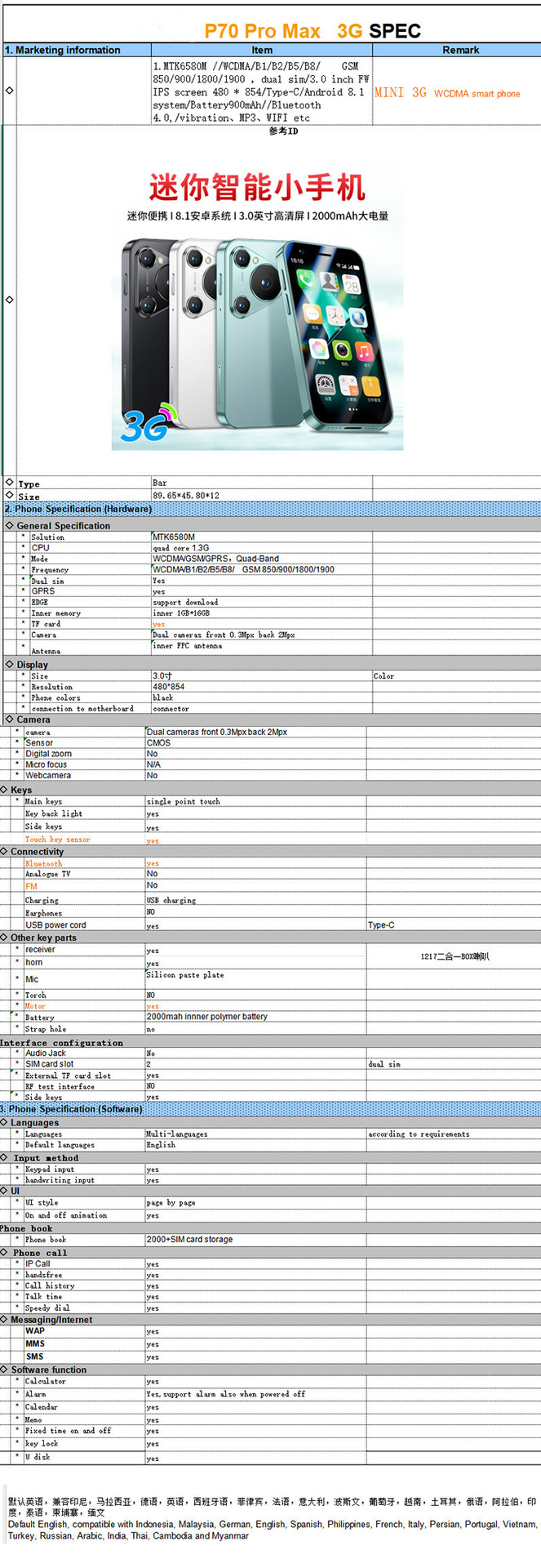 국경 간 휴대 전화 P70promax 미니 스마트 소형 휴대 전화 3inch 쿼드 코어 프로세서 Google Android 외국어 도매