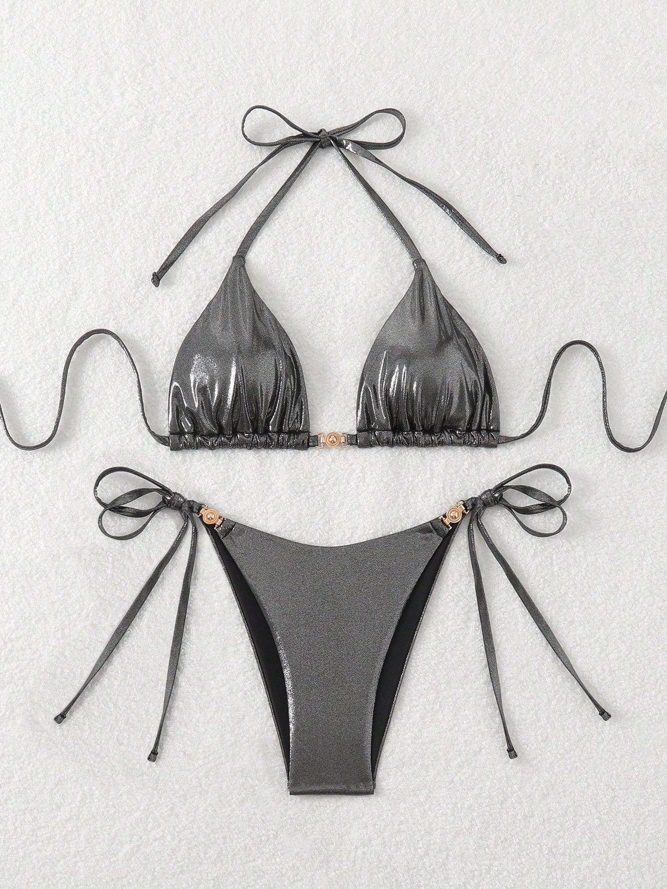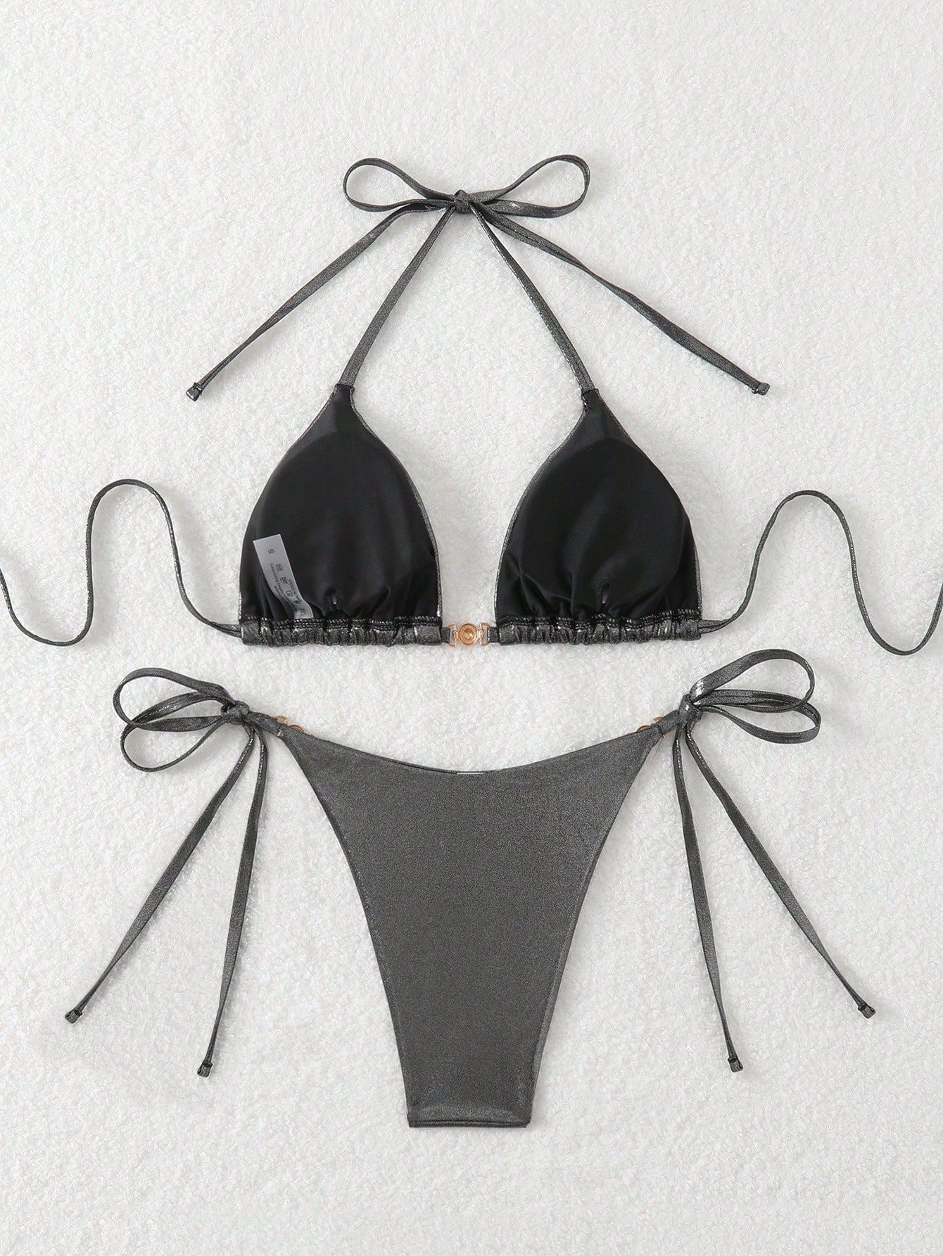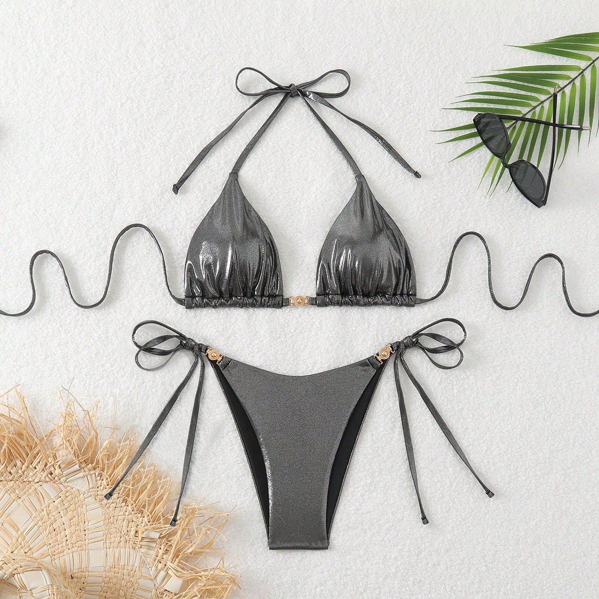 2025 수영복 새로운 솔리드 컬러 비키니 섹시한 레이스 업 홀터넥 비키니 여성의 작은 신선한 스플릿 수영복스토어 가기