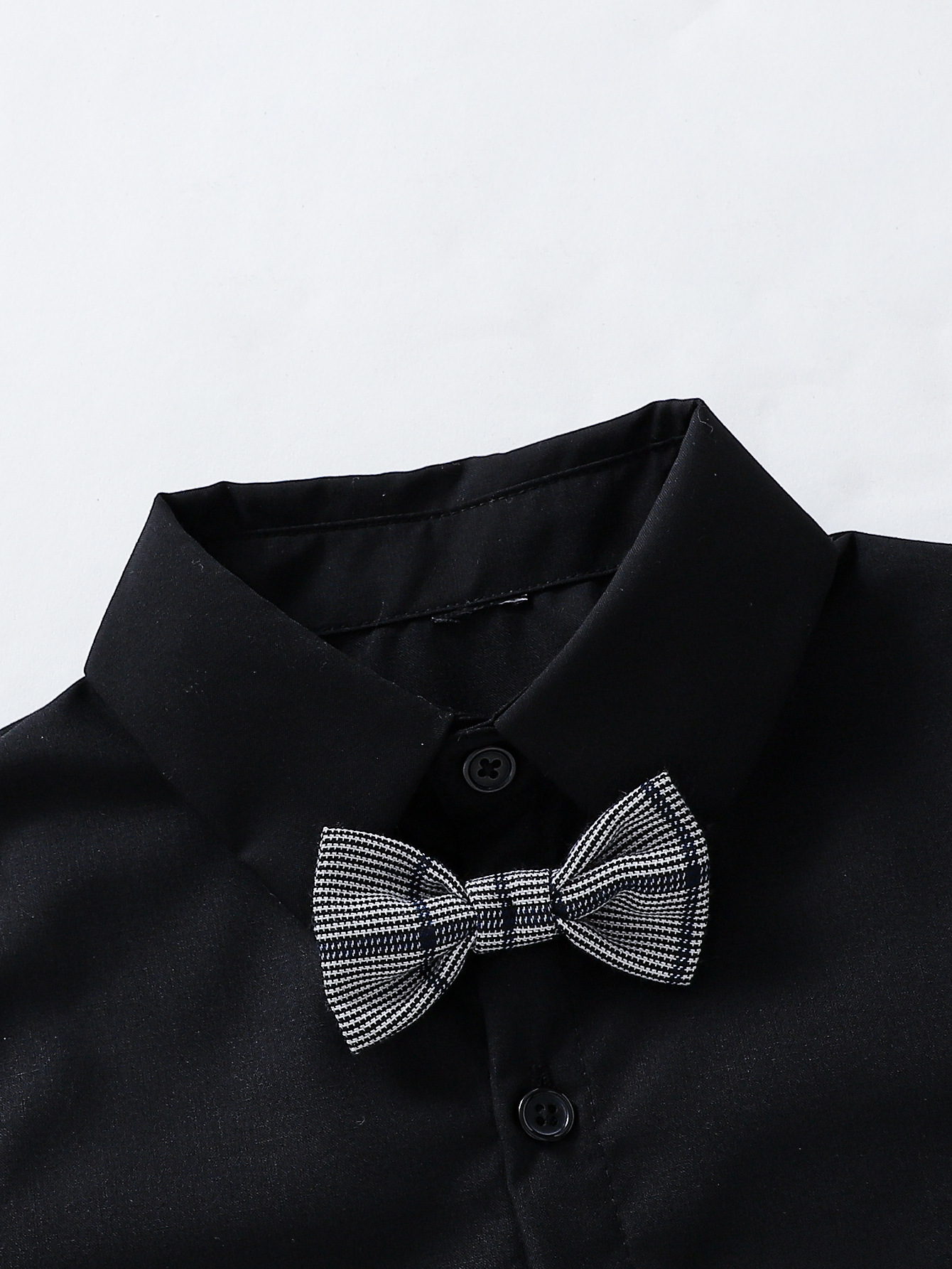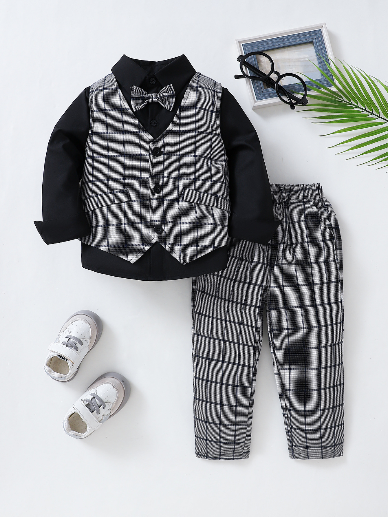소년 봄, 가을 긴팔 검은색 셔츠와 나비 넥타이 + 회색 격자 무늬 조끼 바지 신사 정장