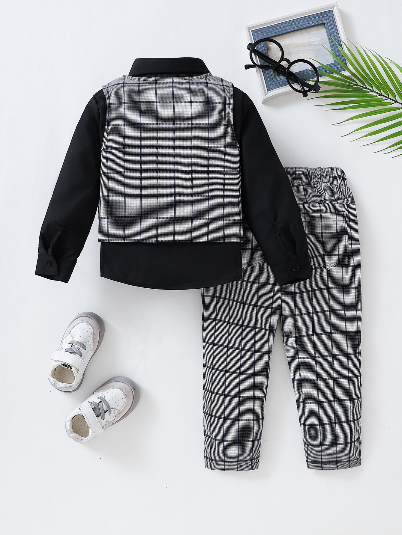 소년 봄, 가을 긴팔 검은색 셔츠와 나비 넥타이 + 회색 격자 무늬 조끼 바지 신사 정장스토어 가기