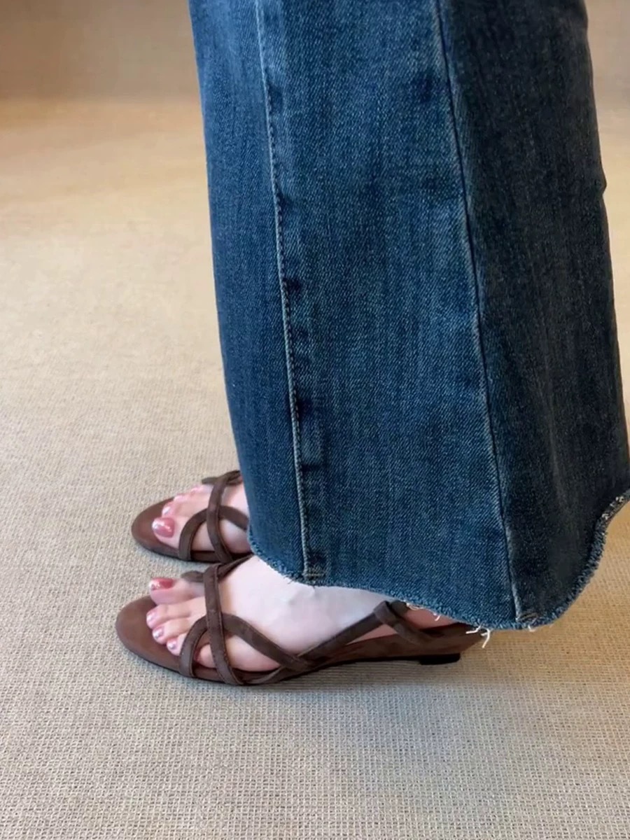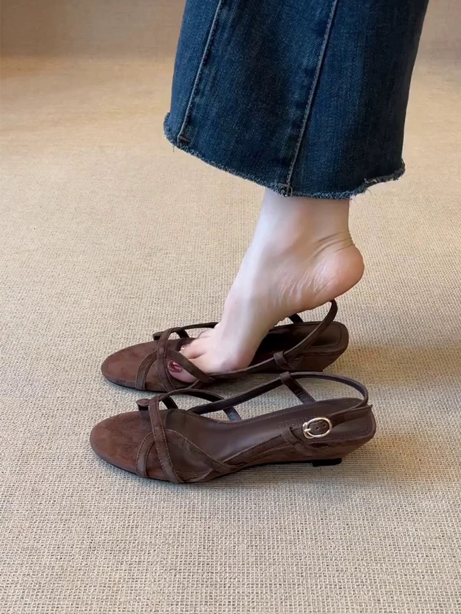 스팟 모델 ~ 레트로 라운드 발가락 중공 틈새 디자인 오픈 발가락 샌들 여성용 소프트 솔 통근 웨지 힐 로마 샌들