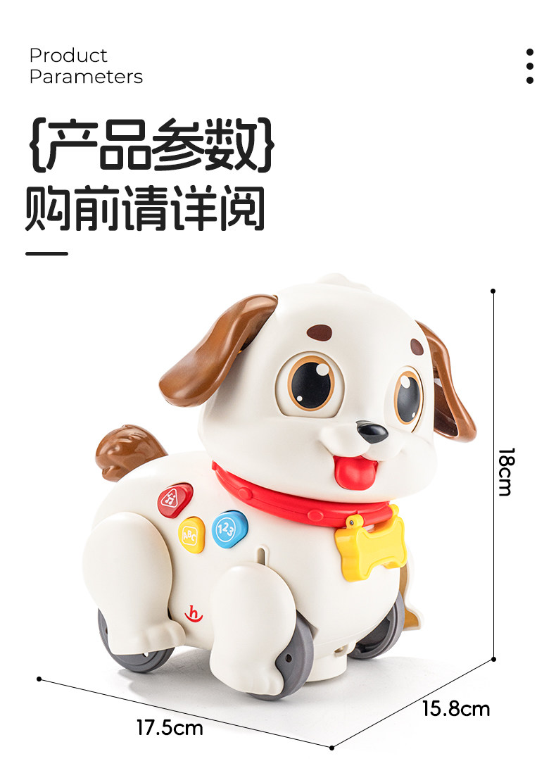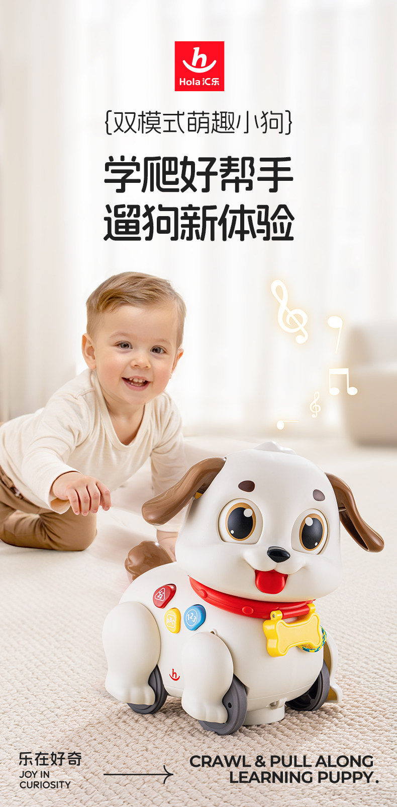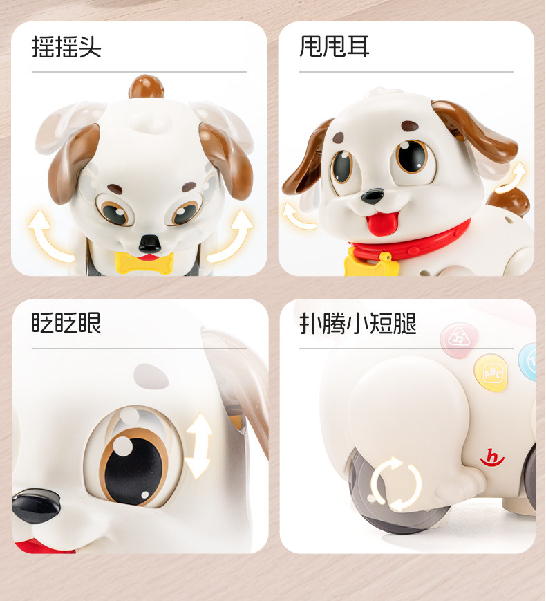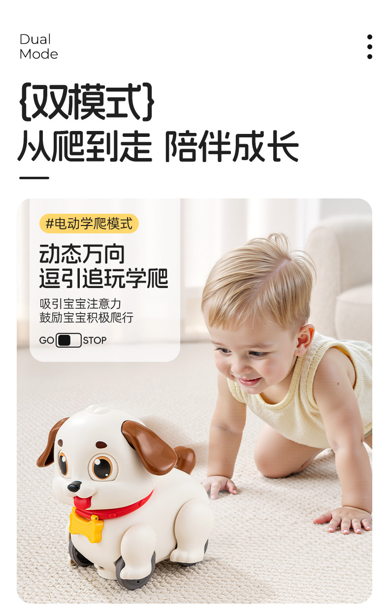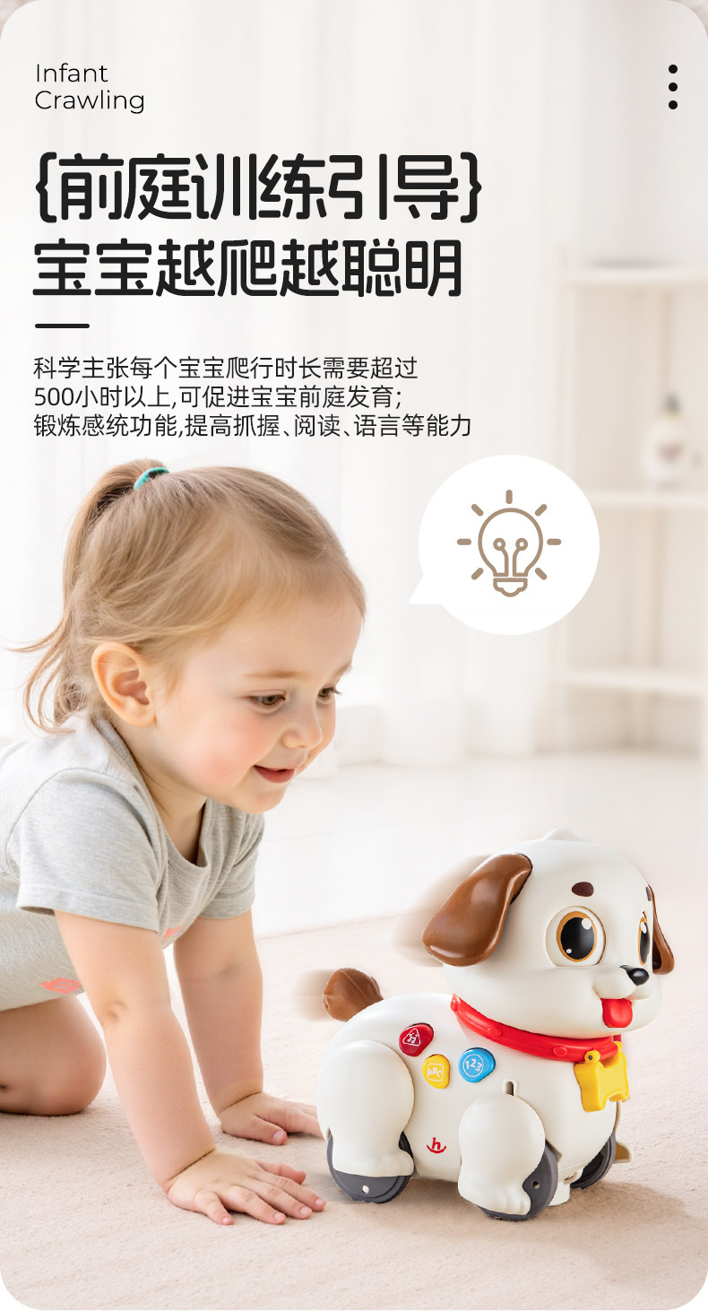 Huile는 6개월 된 아기가 머리를 들어 올리고 기어가는 법을 연습할 수 있도록 전기 로봇 개를 가르칩니다.스토어 가기