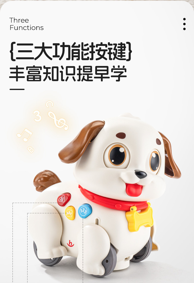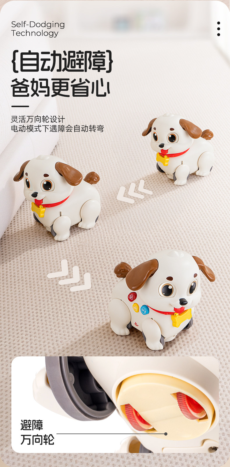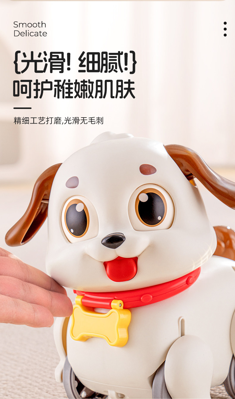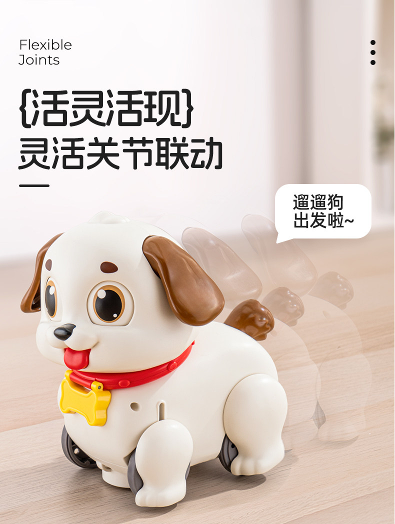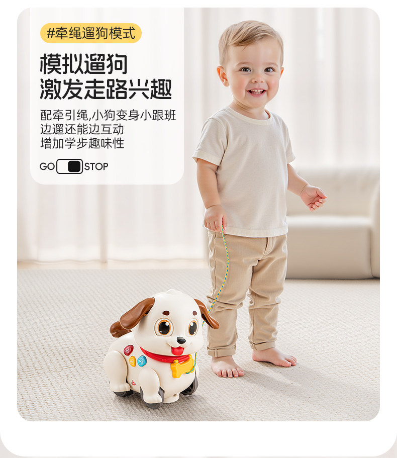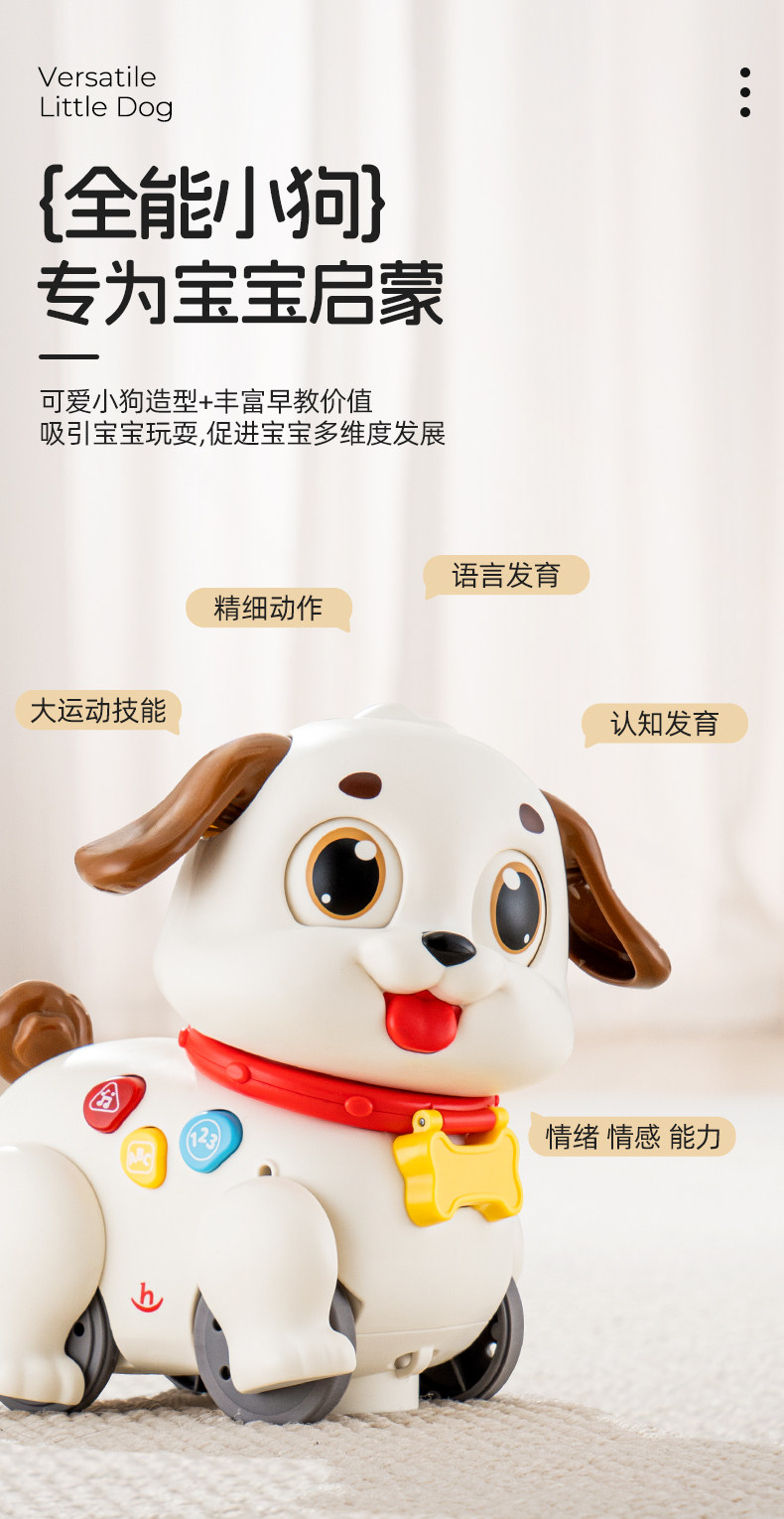 Huile는 6개월 된 아기가 머리를 들어 올리고 기어가는 법을 연습할 수 있도록 전기 로봇 개를 가르칩니다.스토어 가기
