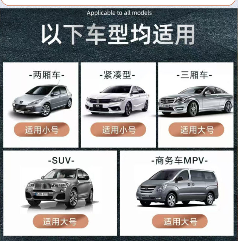 【选款提示】:遮阳伞更适用于常规型车辆;大号140*80cm,小号125*65cm。常规三厢五座式轿车型\紧凑SUV车型推荐选择大号尺寸,小号是两厢两座式迷你车型使用的。