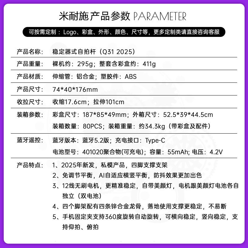 Q31 안정기 휴대 전화 셀카 스틱(보조 조명 포함) 손떨림 방지 확장형 셀카 스틱 4피트 여행용 휴대용