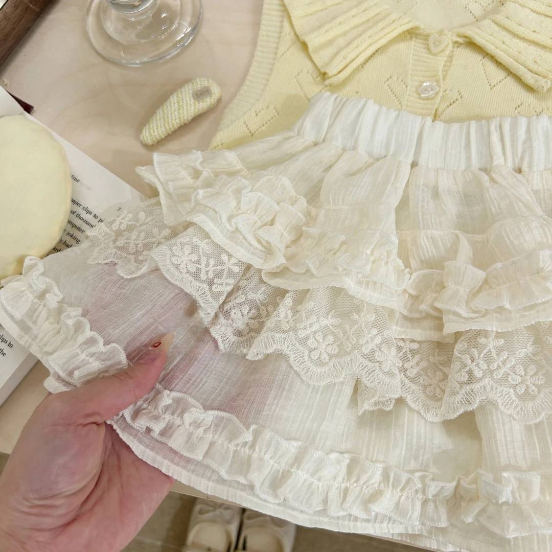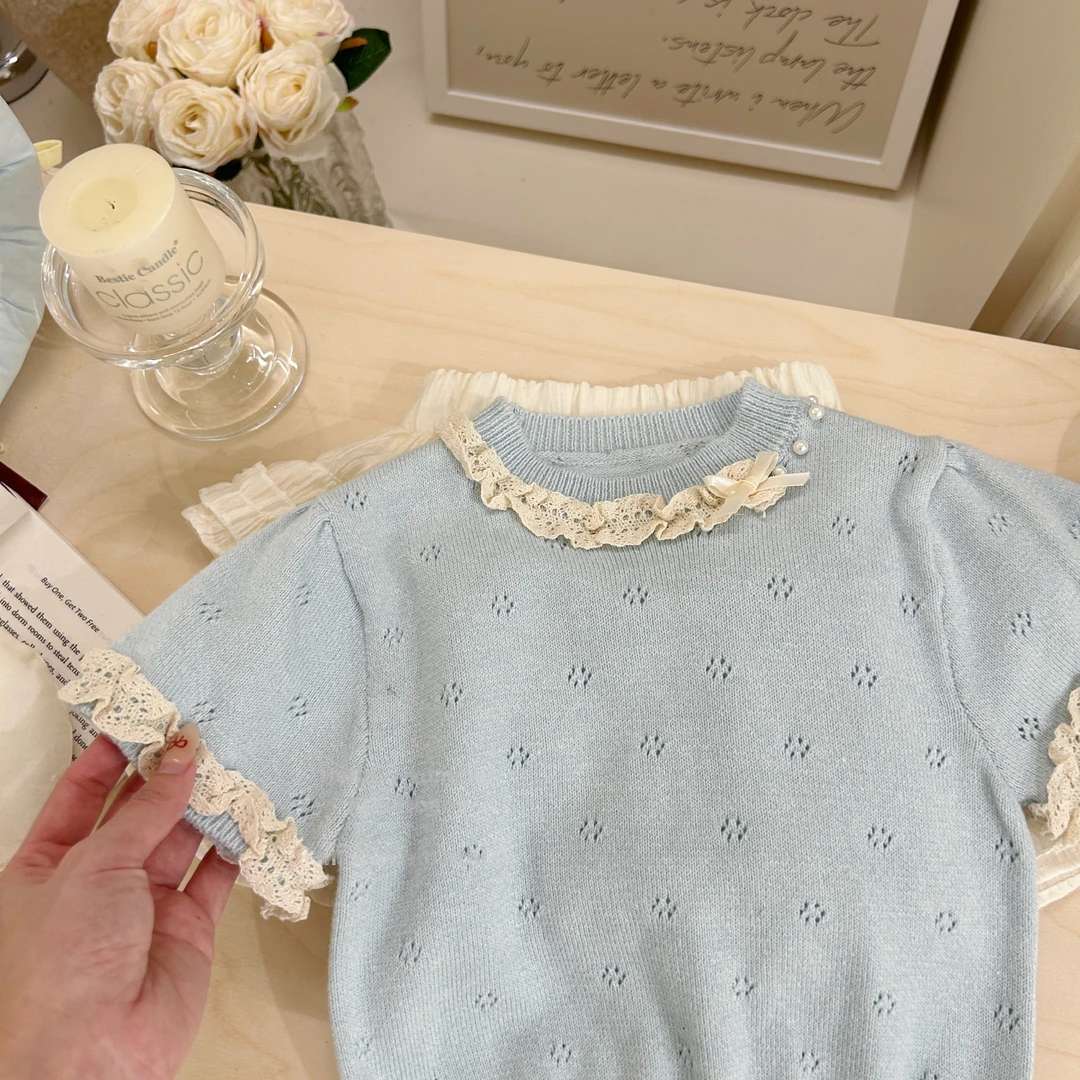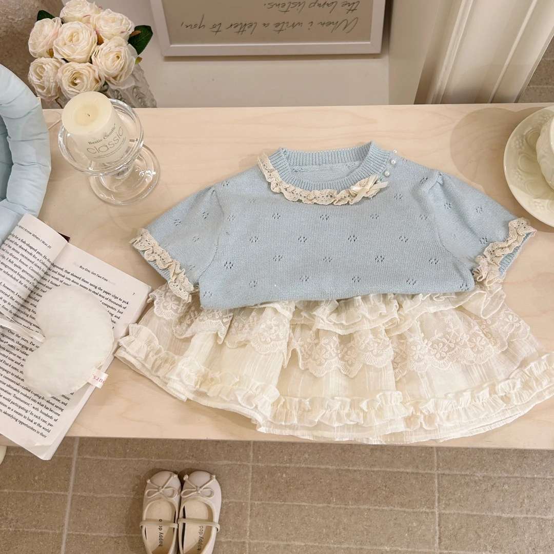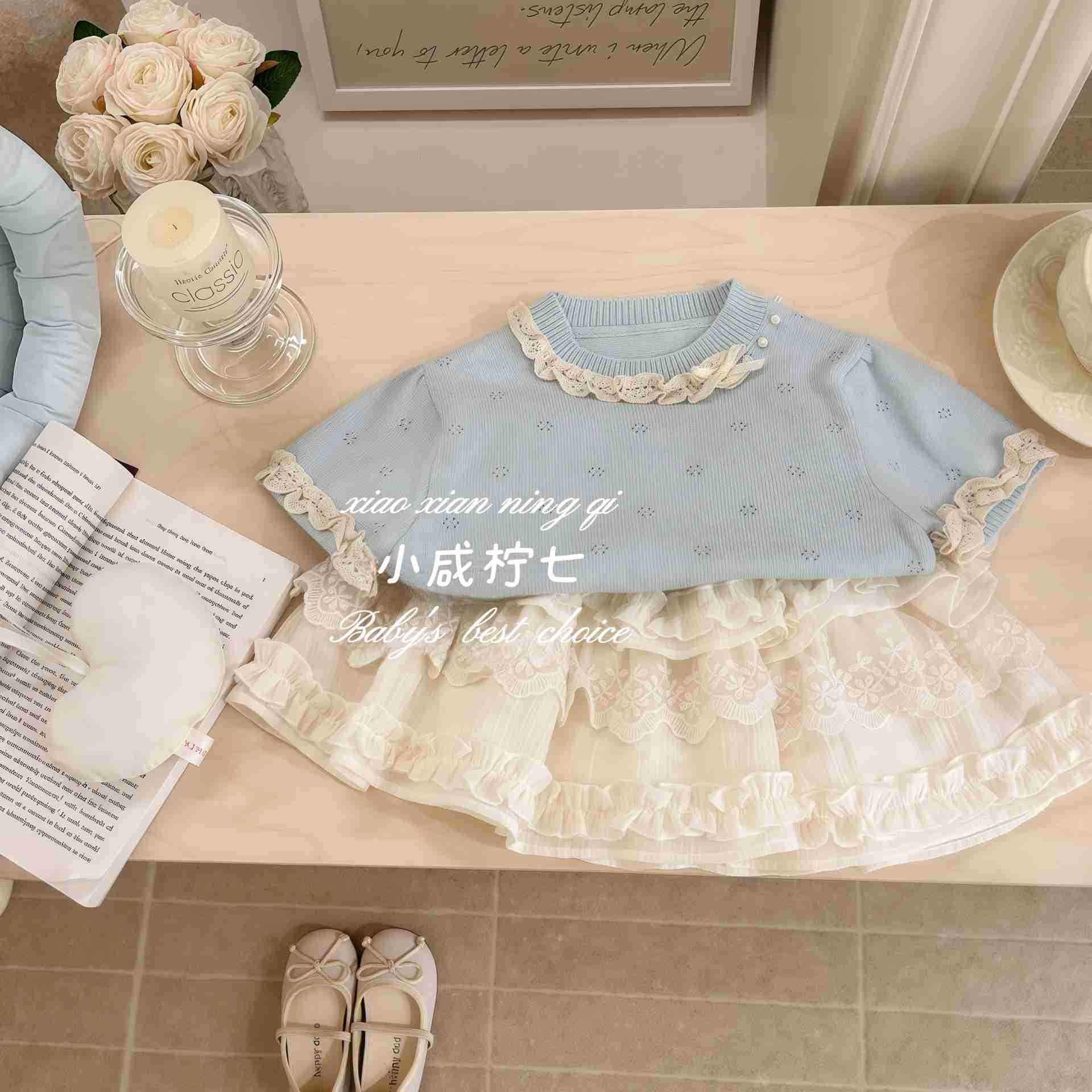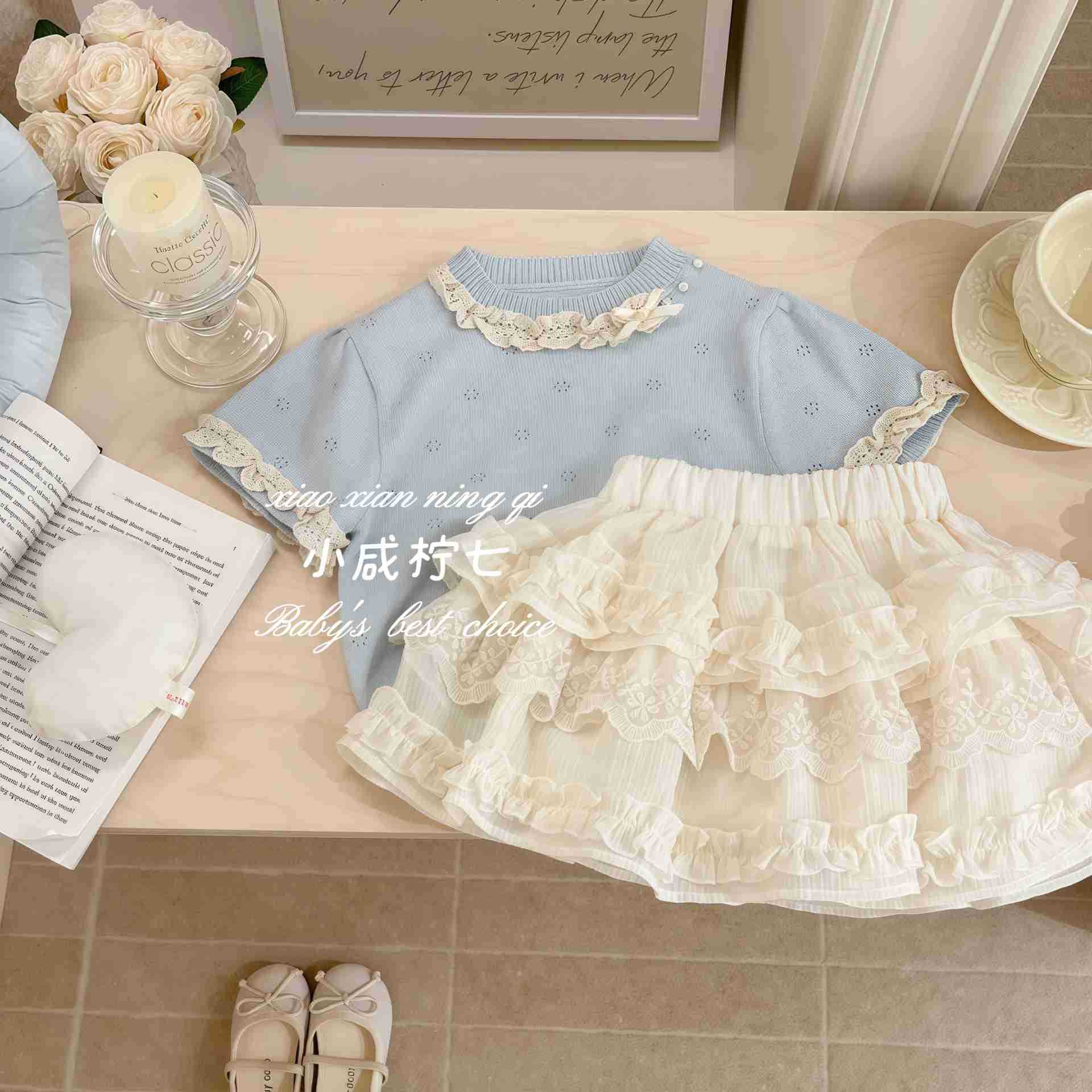 [Little Salty Lemon Seven] 여아 정장 여름 니트 반팔 티셔츠 레이스 베이비 걸스 케이크 스커트 투피스