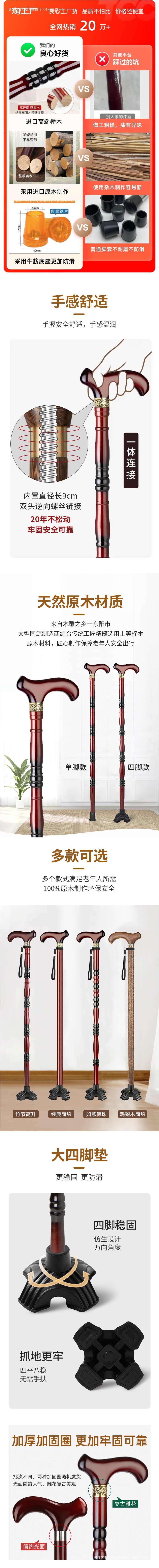 노인용 원목 지팡이, 노인용 4발 미끄럼 방지 지팡이, 경량 수도꼭지, 마호가니 난간, 등산용 목재