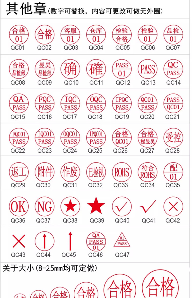 품질검사 승인도장 검사 인증도장 품질합격 문자숫자 직원번호 중국어 영어 소형 원형 도장 문구 각인