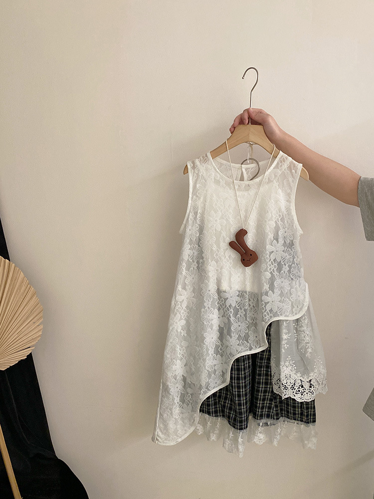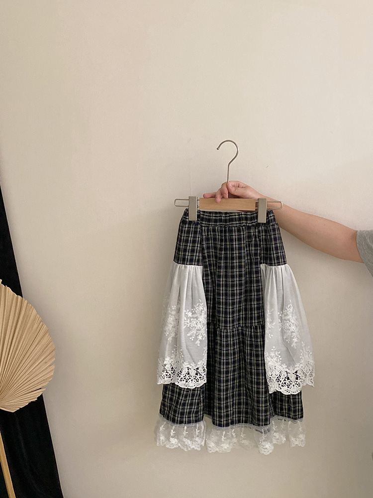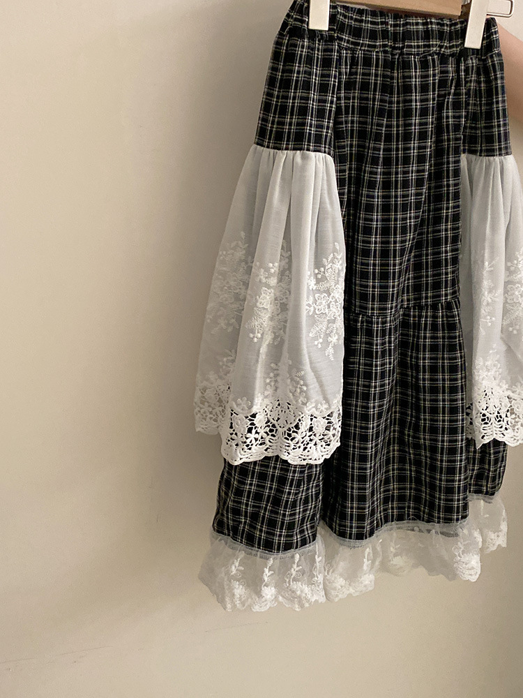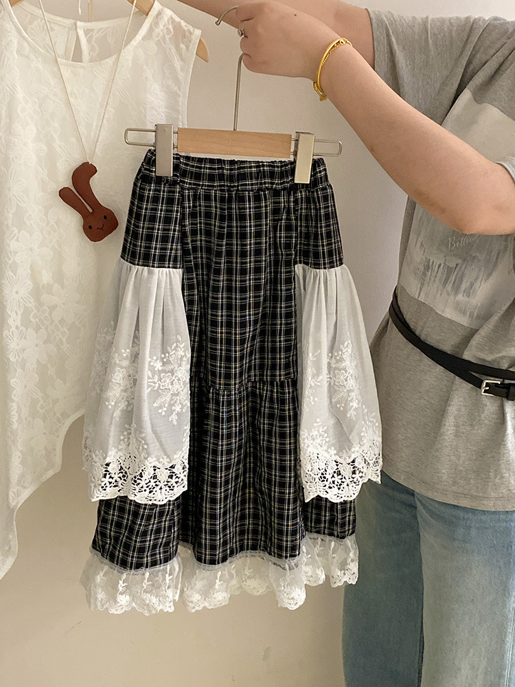 여자 2025 새로운 디자인 불규칙한 레이스 블라우스 스커트 흑백 격자 무늬 스커트 유행 투피스 세트스토어 가기